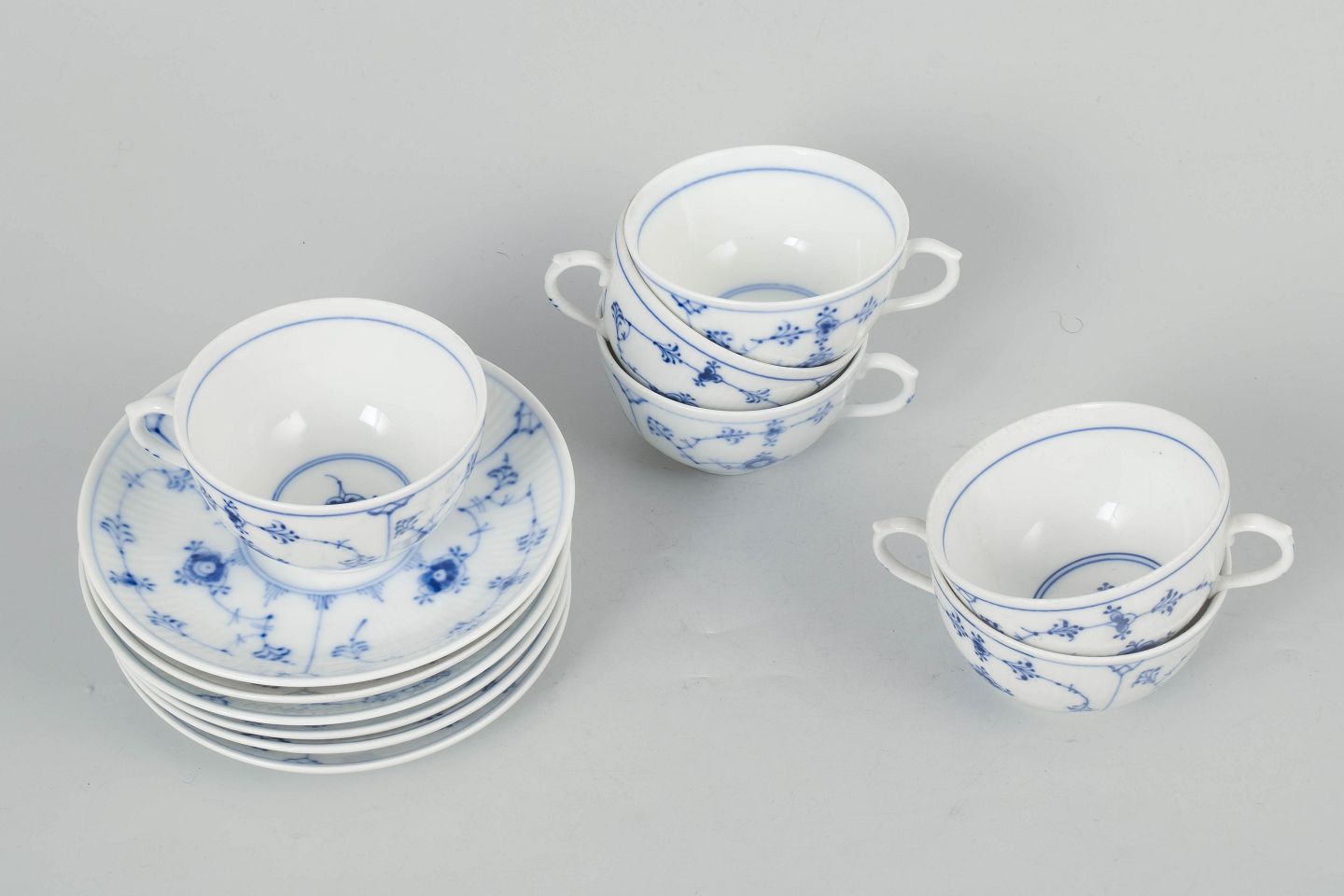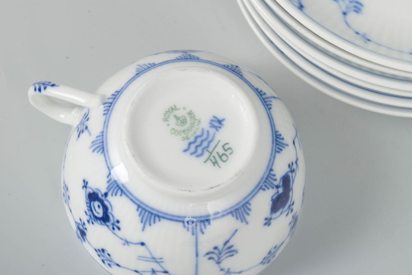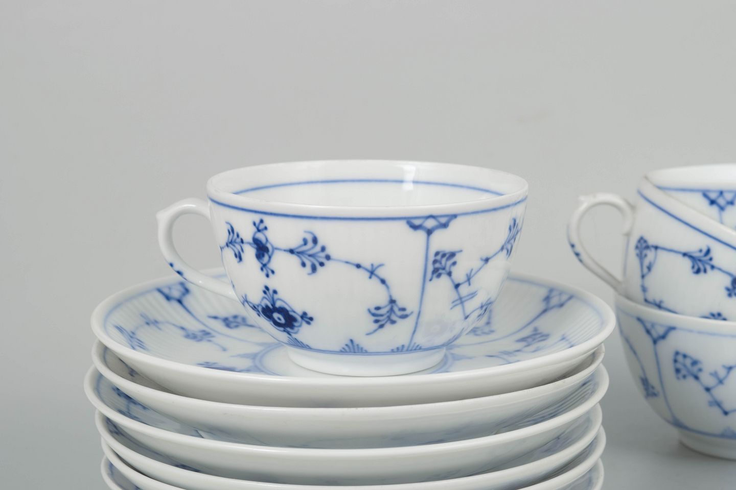 Royal Copenhagen Musselmalet Riflet, sæt af seks kaffekopper med underkopper.Klassisk sæt af seks kaffekopper med matchende underkopper i Royal Copenhagens Musselmalet Riflet stel, model 1/465, udført i håndmalet porcelæn med det ikoniske blå dekorerede mønster. Alle dele er 1. sortering og spænder fra tidligt 20. århundrede til 1980’erne.