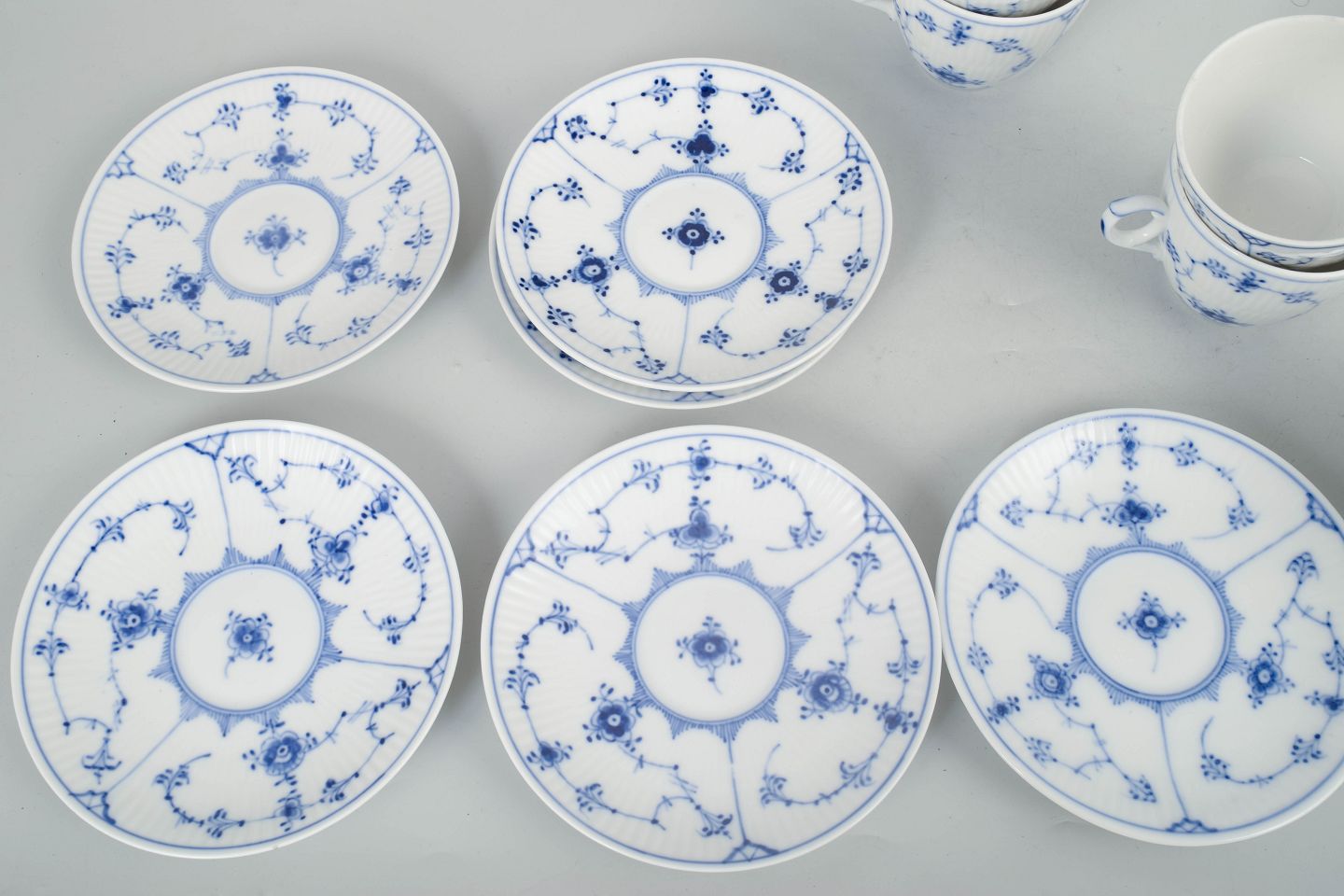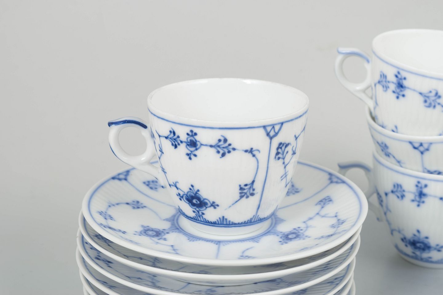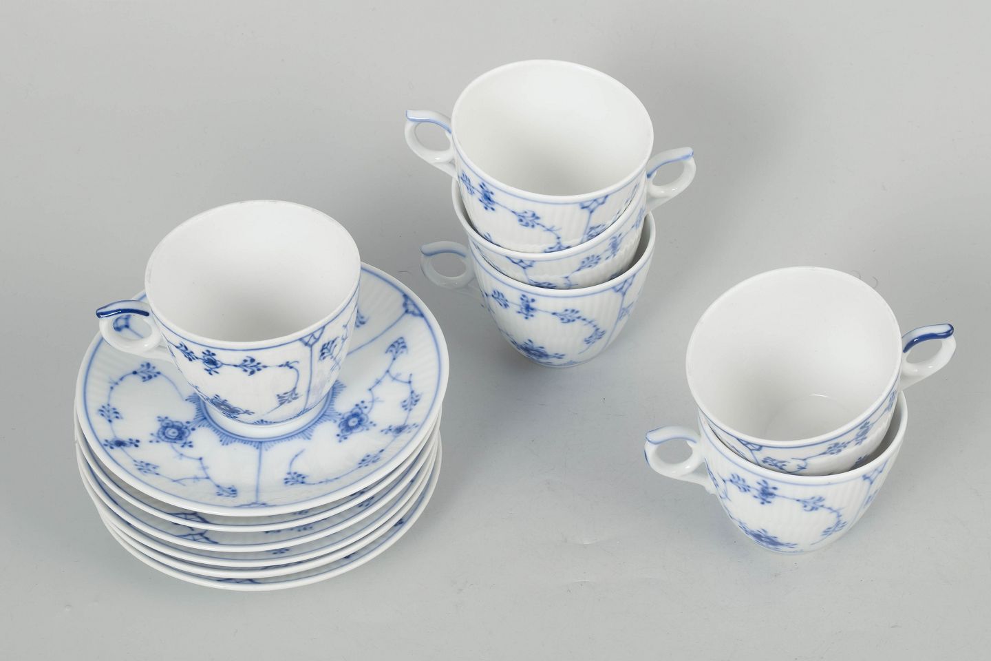 Royal Copenhagen Musselmalet Riflet, sæt af seks kaffekopper med underkopper.Klassisk sæt af seks kaffekopper med matchende underkopper i Royal Copenhagens Musselmalet Riflet stel, model 1/80, udført i håndmalet porcelæn med det ikoniske blå dekorerede mønster. Alle dele er 1. sortering og produceret mellem 1920’erne og 1980’erne.