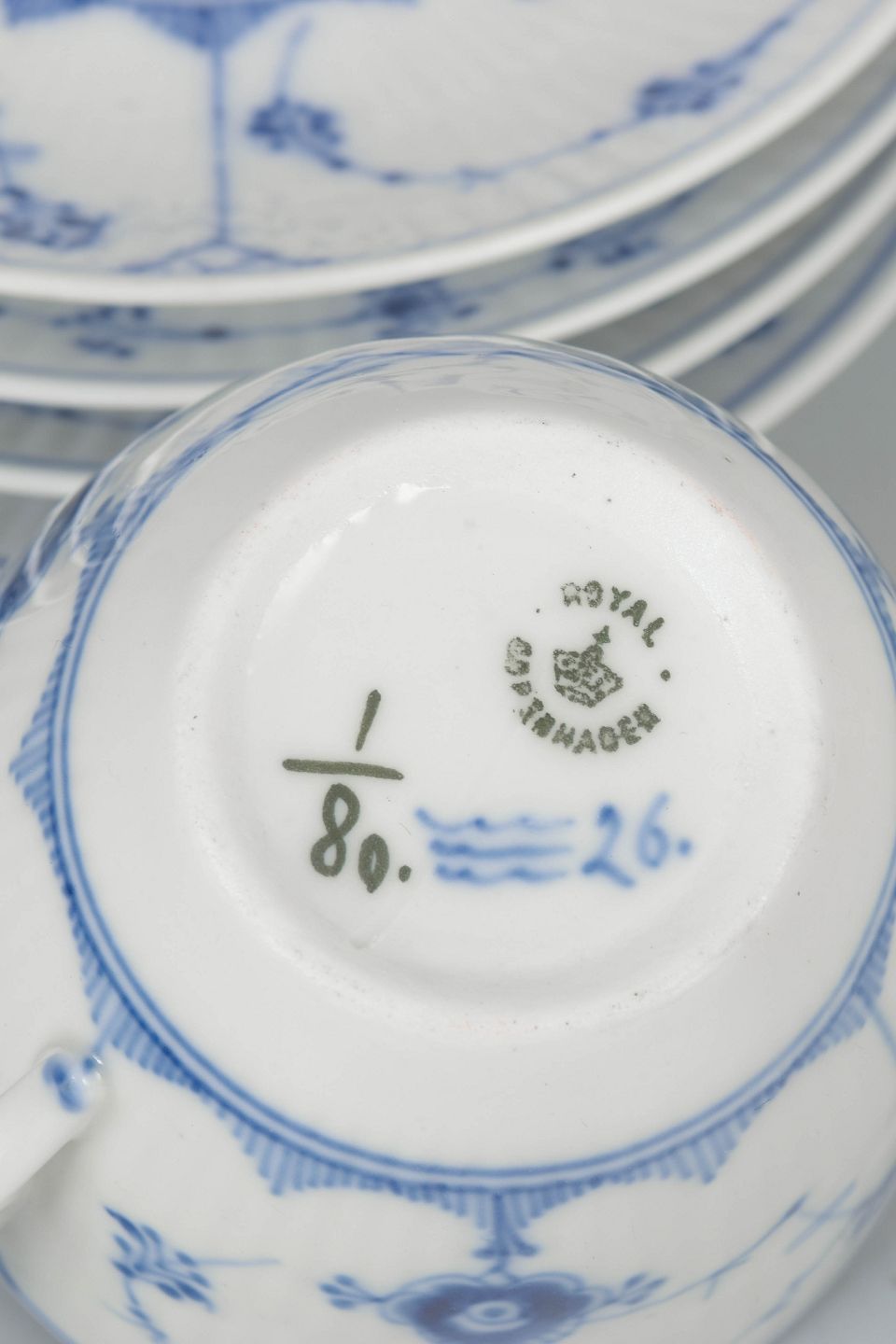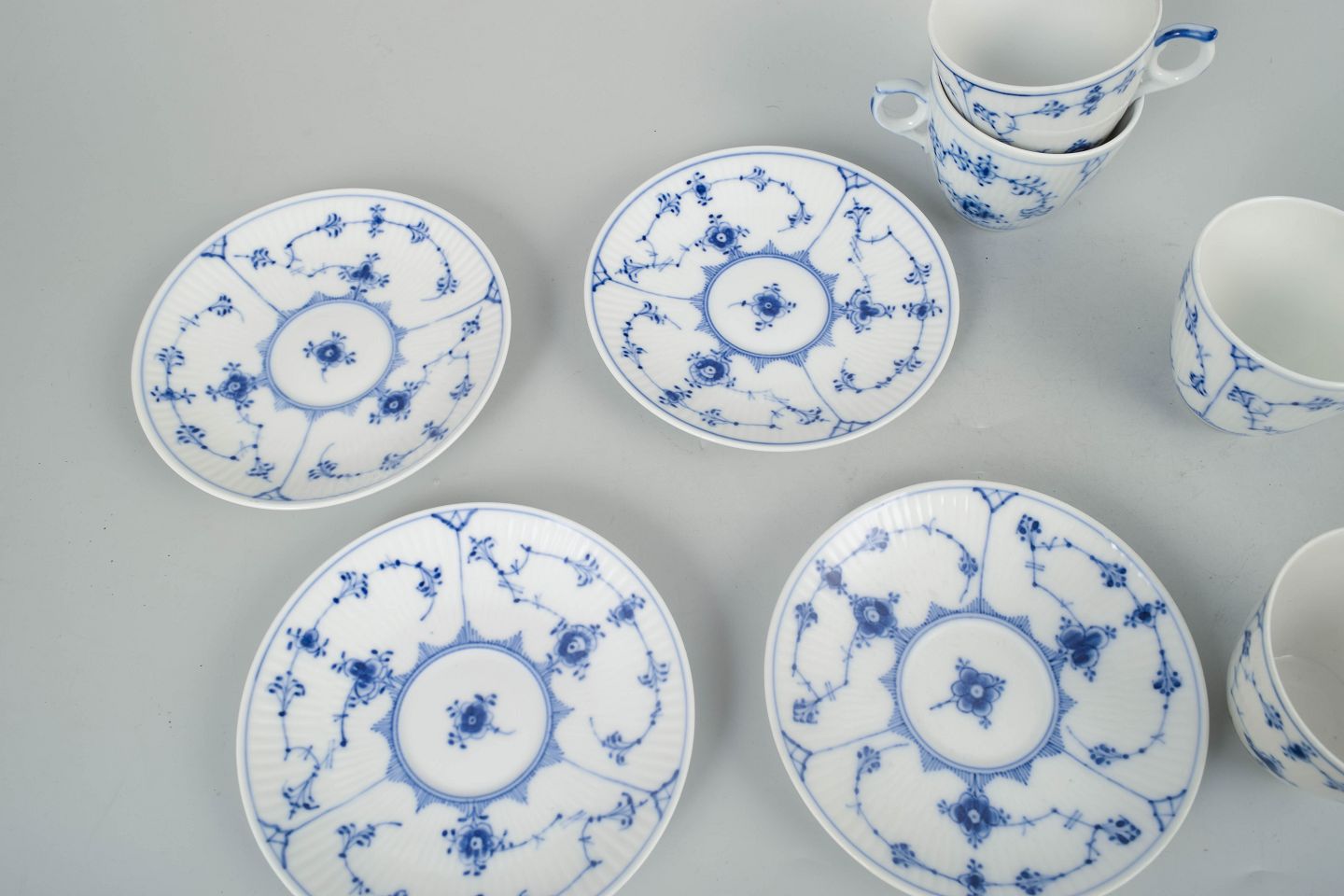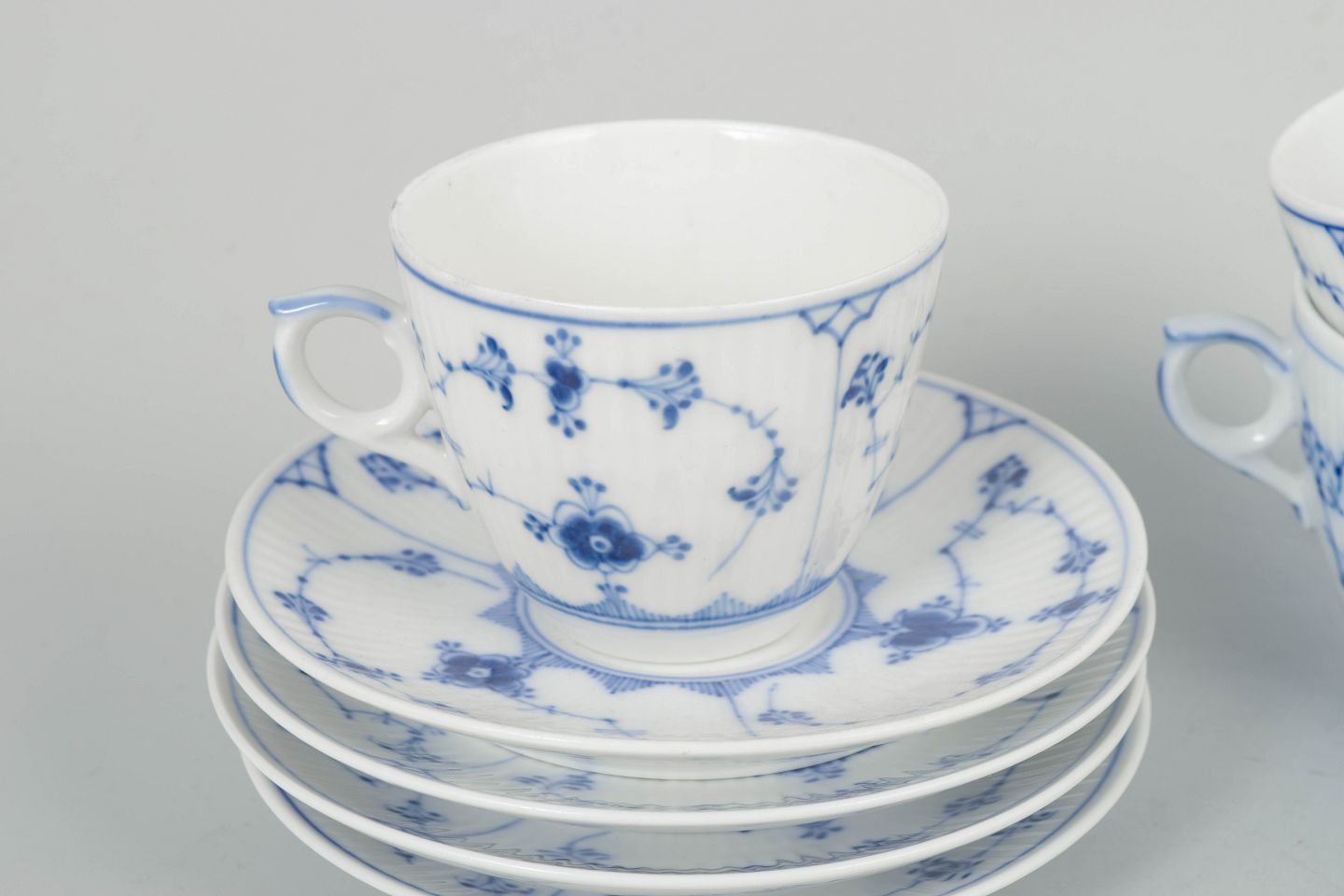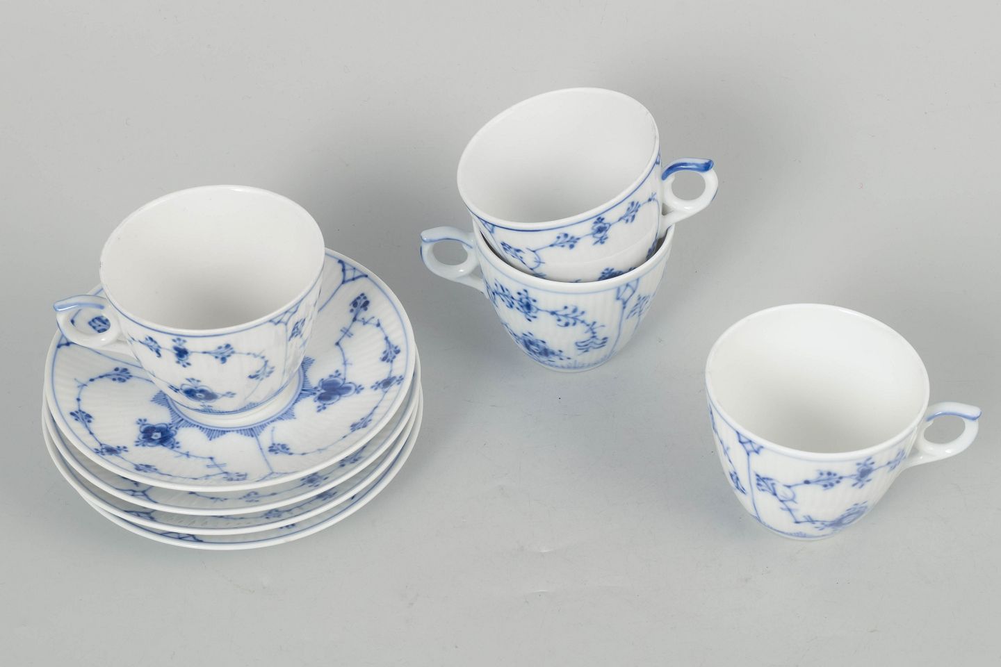 Royal Copenhagen Musselmalet Riflet, sæt af fire kaffekopper med underkopper.Klassisk sæt af fire kaffekopper med matchende underkopper i Royal Copenhagens Musselmalet Riflet stel, model 1/80, udført i håndmalet porcelæn med det ikoniske blå dekorerede mønster. Alle dele er 1. sortering og produceret mellem 1920’erne og 1980’erne.