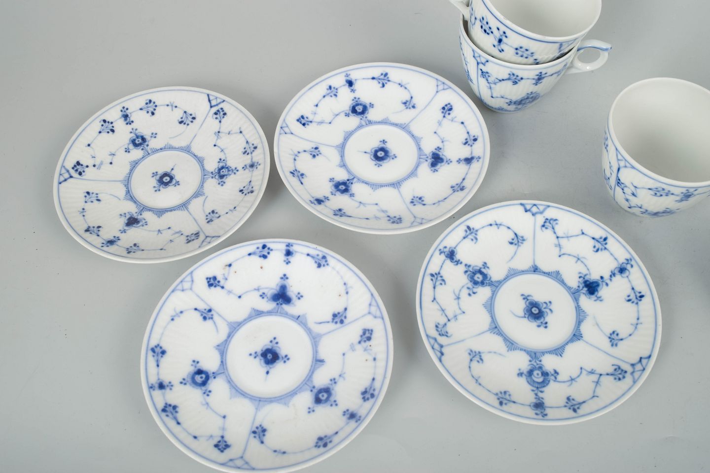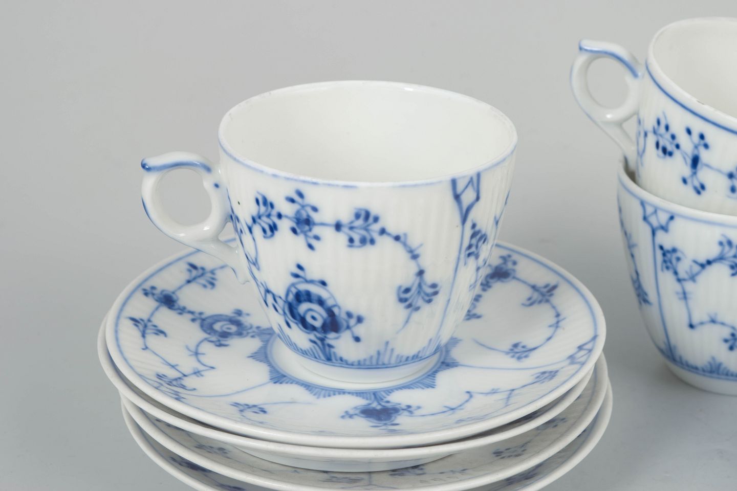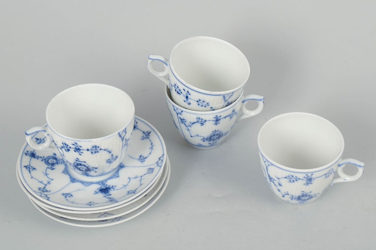 Royal Copenhagen Musselmalet Riflet, sæt af fire kaffekopper med underkopper.Klassisk sæt af fire kaffekopper med matchende underkopper i Royal Copenhagens Musselmalet Riflet stel, model 1/80, udført i håndmalet porcelæn med det ikoniske blå dekorerede mønster. Kopperne stammer fra perioden mellem 1920’erne og 1980’erne, med variation i fabrikssortering.