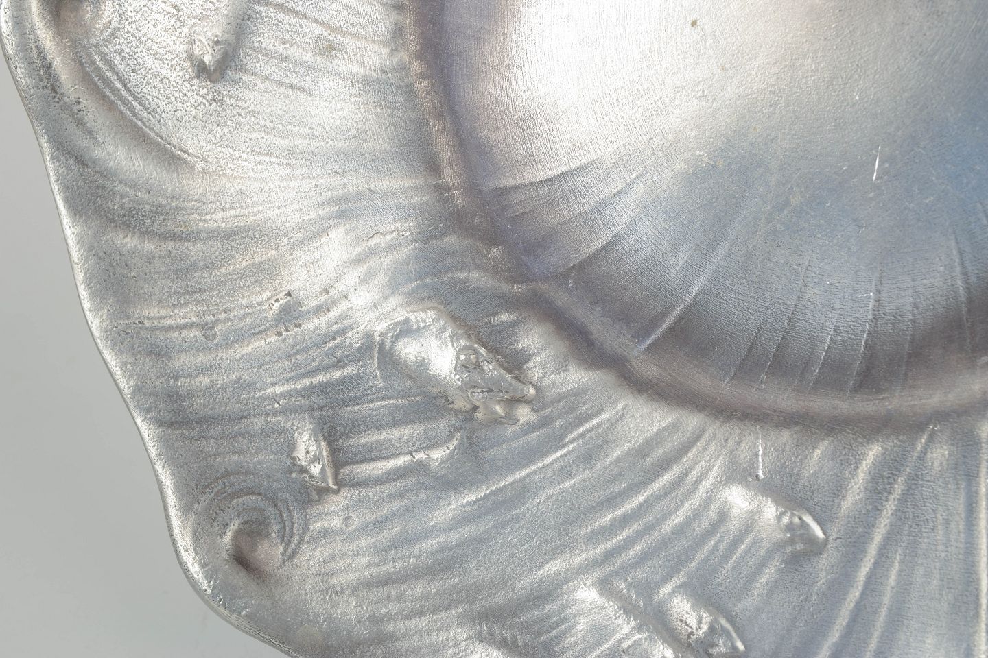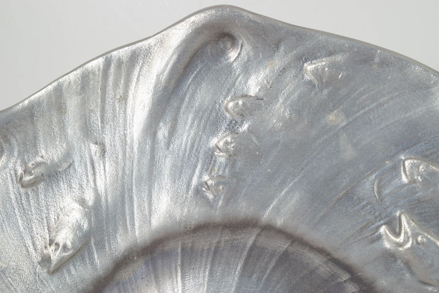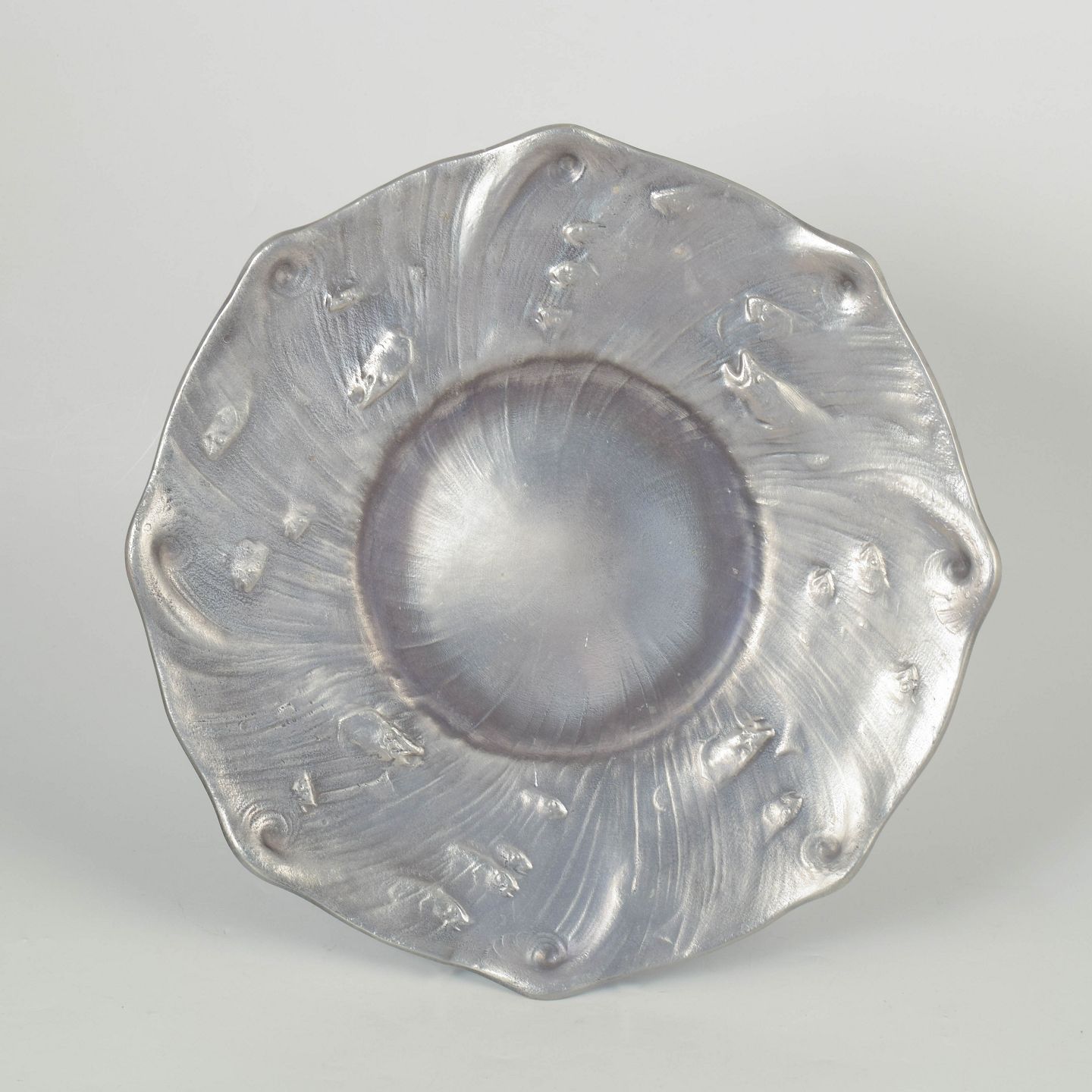 Olof Ahlberg for Schreuder & Olsson, stort skønvirke fad.Stort dekorativt fad i tin med organisk bølgende form og fiske reliefdekoration, produceret for Schreuder & Olsson, Stockholm.