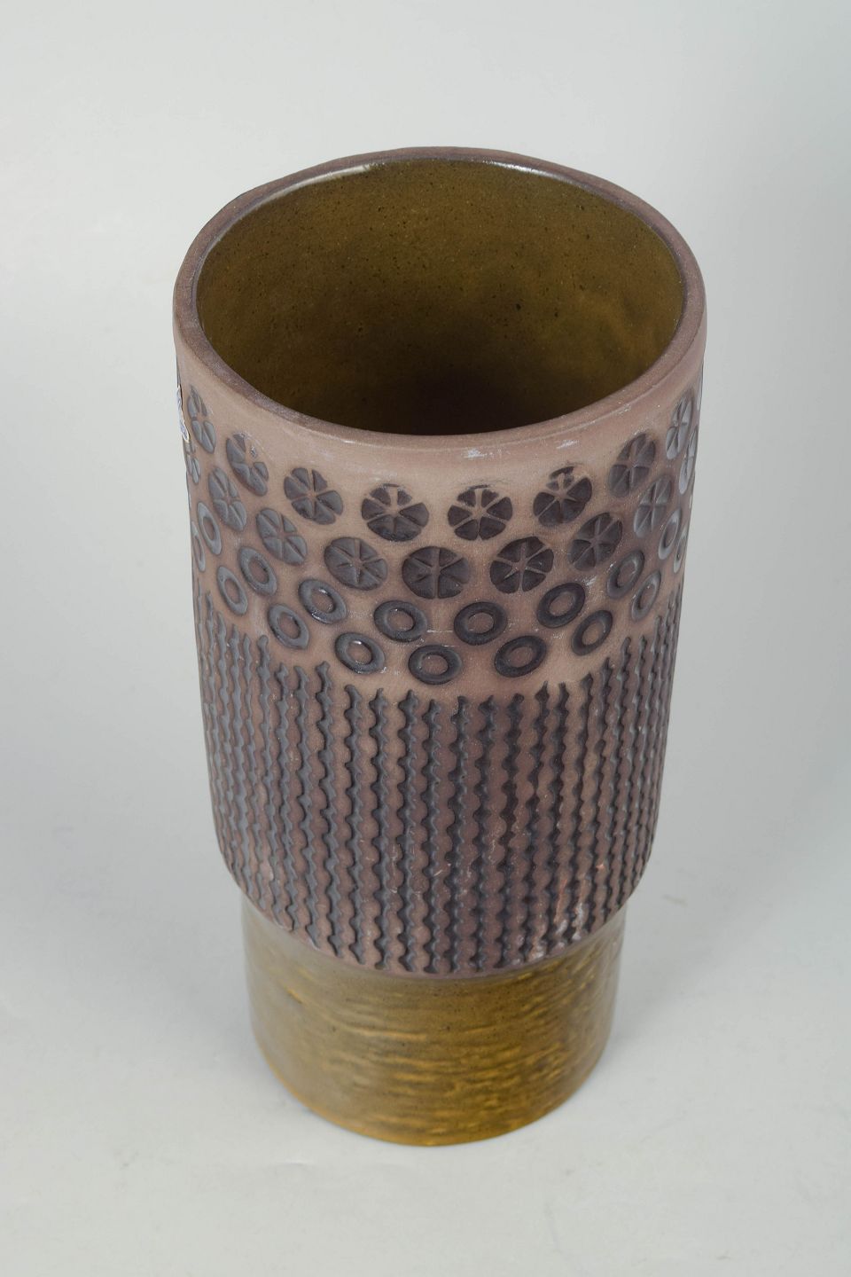 Mari Simmulson for Upsala Ekeby, vase.Høj cylindrisk keramikvase model 6074M med reliefdekoreret overflade i geometriske mønstre og håndglaserede nuancer i rosa, grå og olivengrøn.