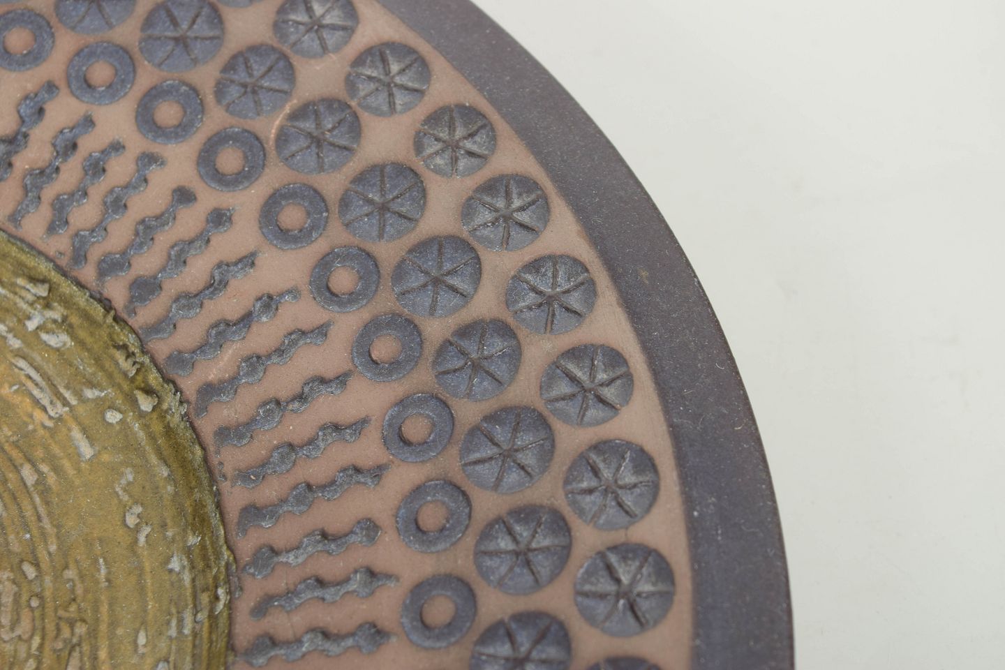 Mari Simmulson for Upsala Ekeby, fad.Stort rundt keramikfad model 6071M med geometrisk reliefdekoration i koncentriske mønstre og håndglaserede jordfarver i rosa, grå og olivengrønne nuancer.
