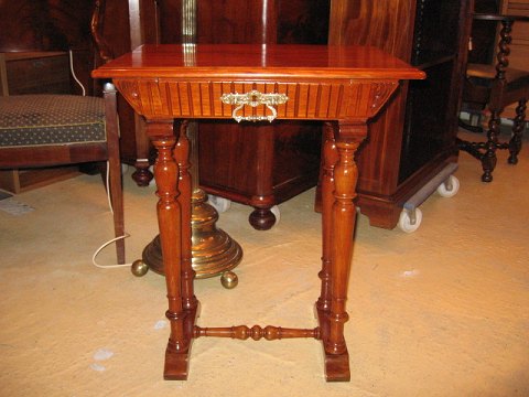 Mahogni Sybord håndpoleret med 1 skuffe ca år 1900. Mål B 58, D 44, H 70,cm. 5208/09-xx Udstiller