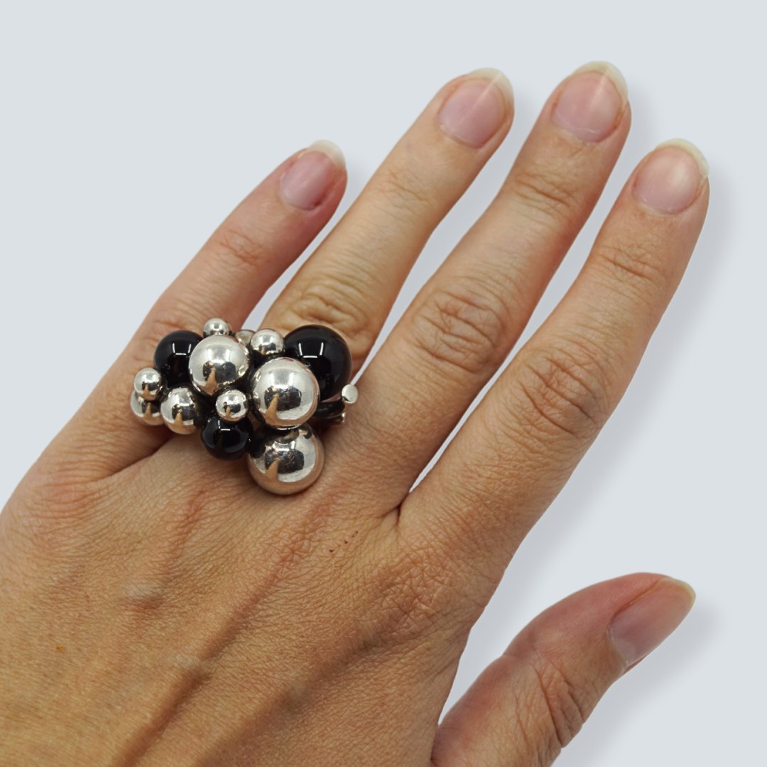Georg Jensen; A Moonlight Grapes ring of sterling silver set with onyx