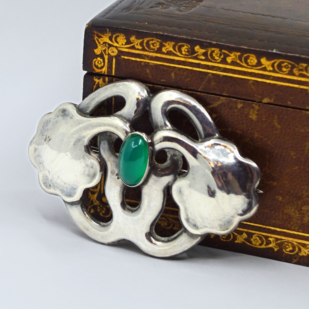 Bernhard Hertz; Skønvirke broche af sølv prydet med chrysopras.
