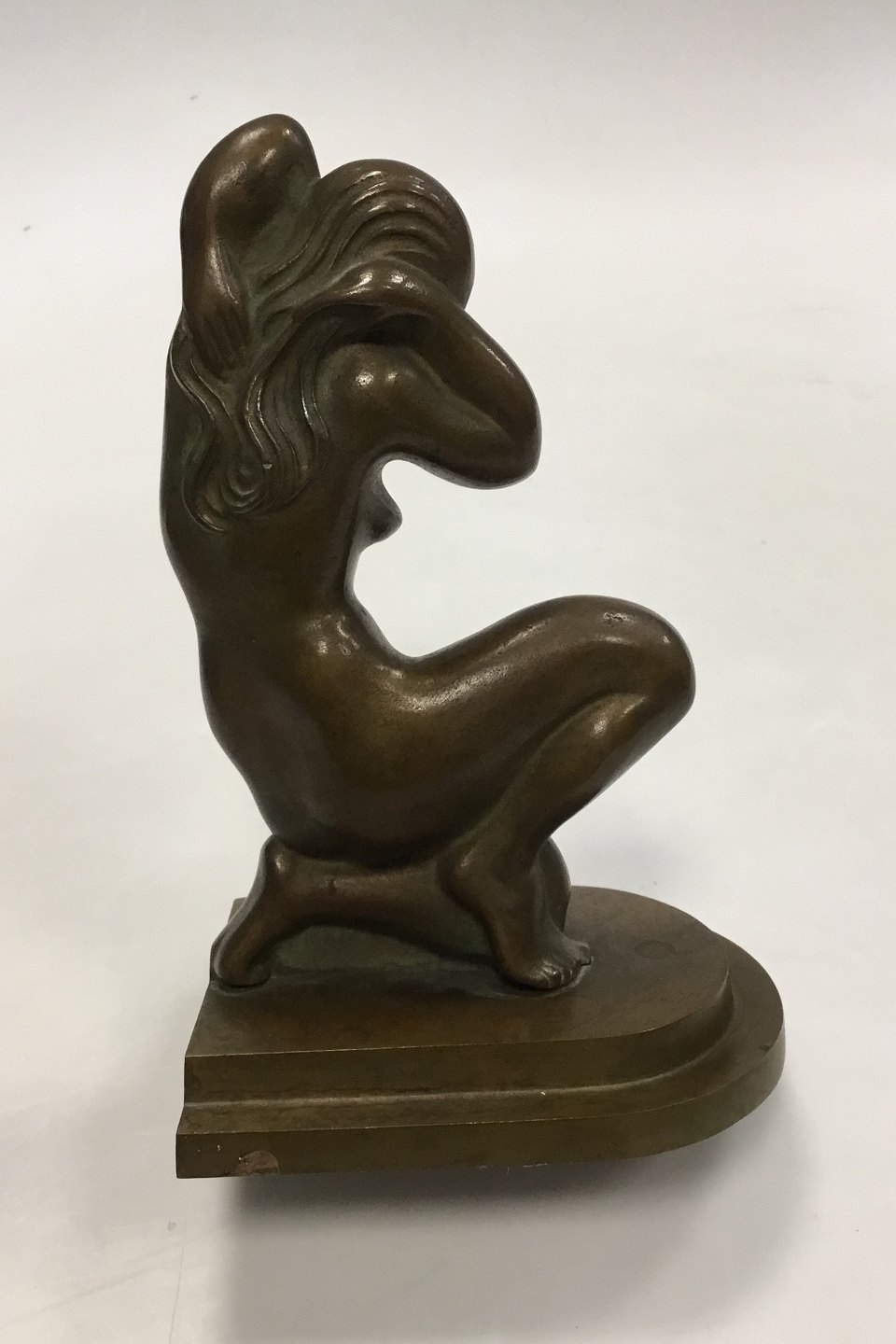 Bronzefigur/Bogstøtte af knælende kvinde. Fremstillet af Tinos Danmark. Måler 19 cm(7 31/64 in.) høj og vejer 2,38 kg. Fra 1930-erne