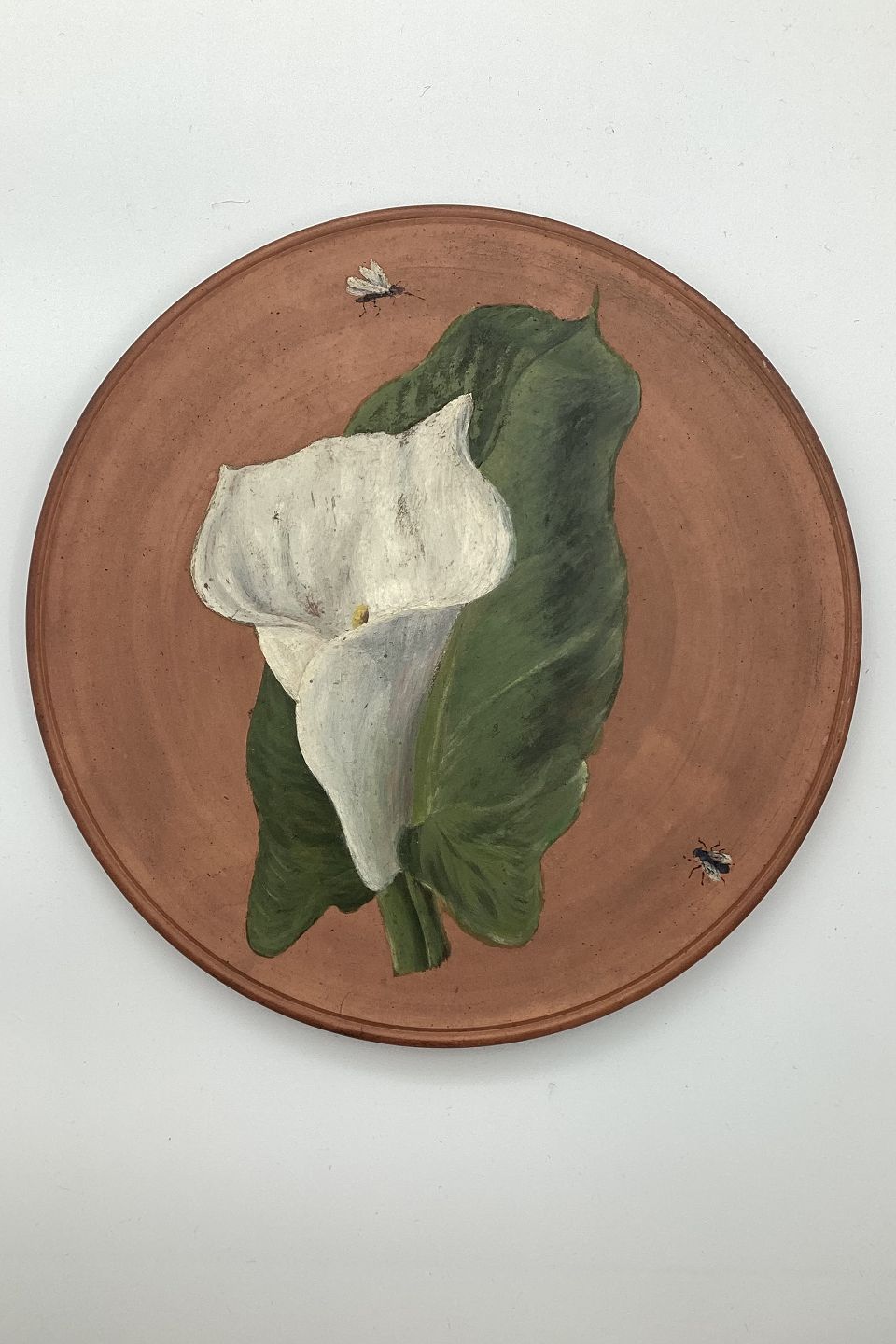 Terracotta platte fra Peter Ipsen, Kjøbenhavn, fremstillet omkring 1900. Bemalet art nouveau dekoration med hvid lilje samt et par insekter. I god stand. Måler 20,5cm (8.07 inch)