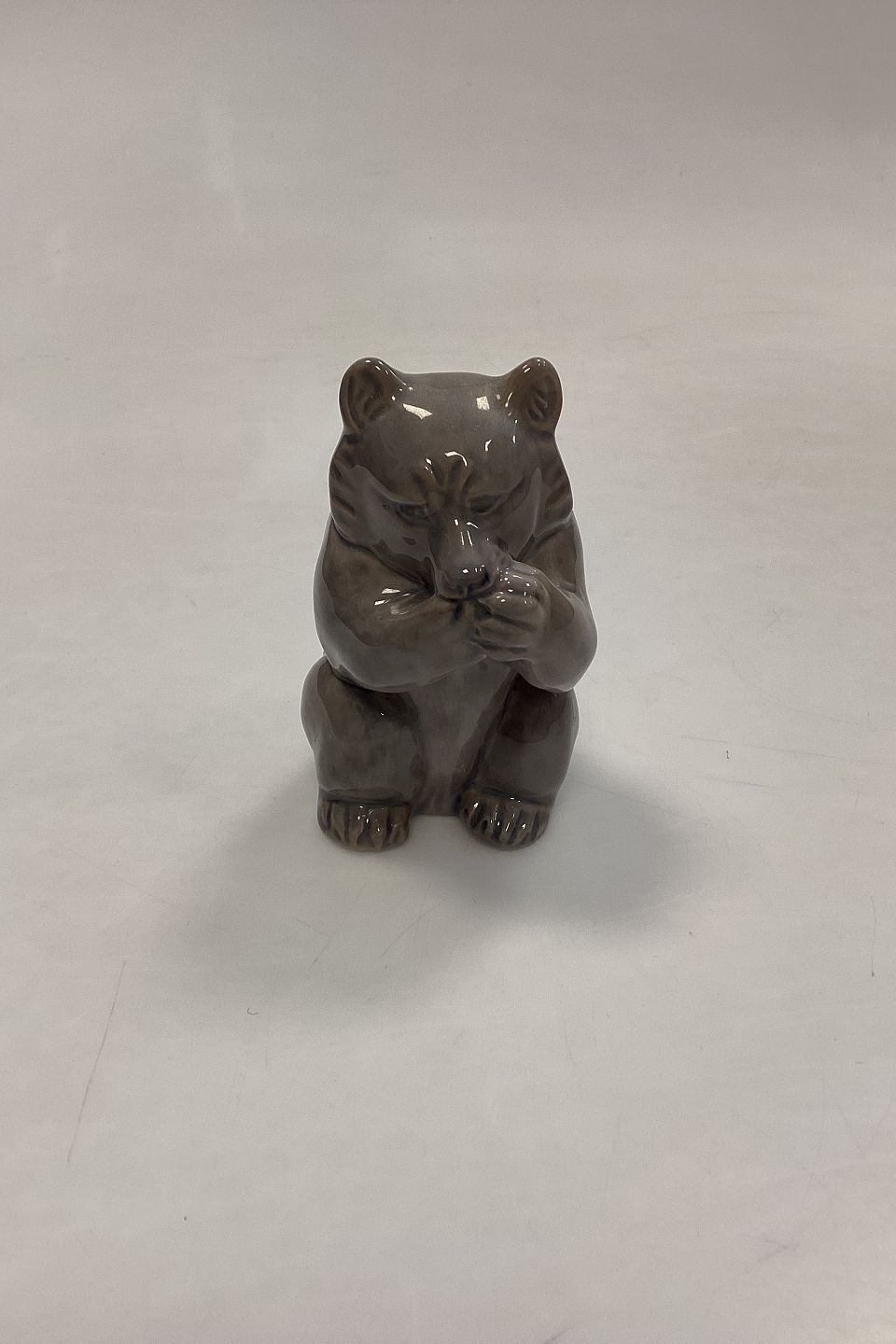 Royal Copenhagen Figur af Bjørneunge No. 3014. Designet af Knud Kyhn. Måler 9 cm / 3,54 in. Lysegrå nuancer.