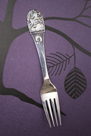 Barnegaffel i sølv (stemplet) med børnemotiver på skaftet af H. C. Andersen ...