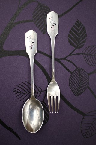 Barnebestik , ske og gaffel i sølv (stemplet) med storke motiv øverst på skaftet...