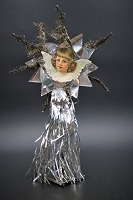 Antikt tinsel juletræspynt , engel i pap med sølv tinsel.