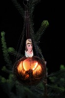 Gammelt juletræspynt , fin dame der holder en lille julemand ,