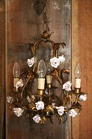 Old French chandelier in green painted metal decorated with fine colored/white porcelain flowers. . .