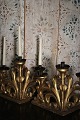 Gammel fransk alterlysestage (hjørnestage) i forgyldt træ med fine dekorationer , lysholder i metal og har plads til 3 stearinlys og med en fin patina. (2 stk. haves som kan danne et par)