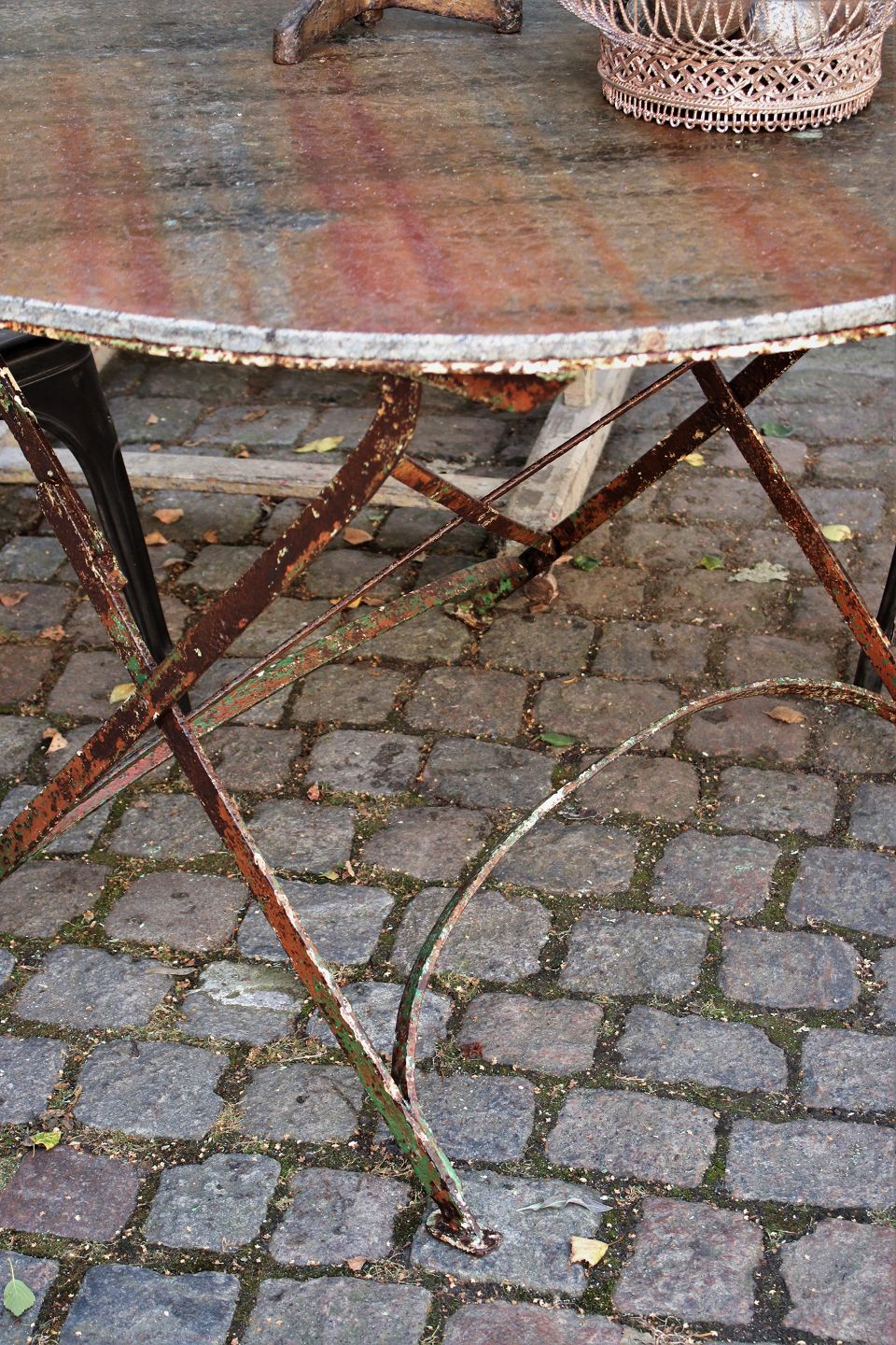 Old garden table from the South of France with raw stone top and wrought iron base with a super fine patina (can be folded together) H:72cm. Dia.:110cm. Usable both inside and outside.
