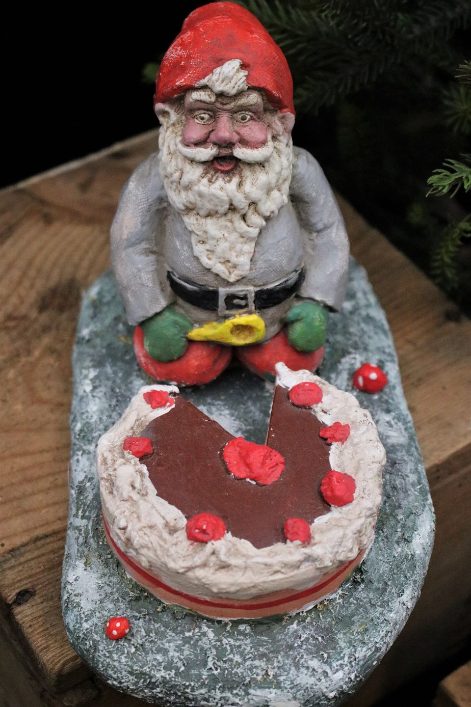 Julemand med lagkage i bemalet gips med en fin gammel patina.