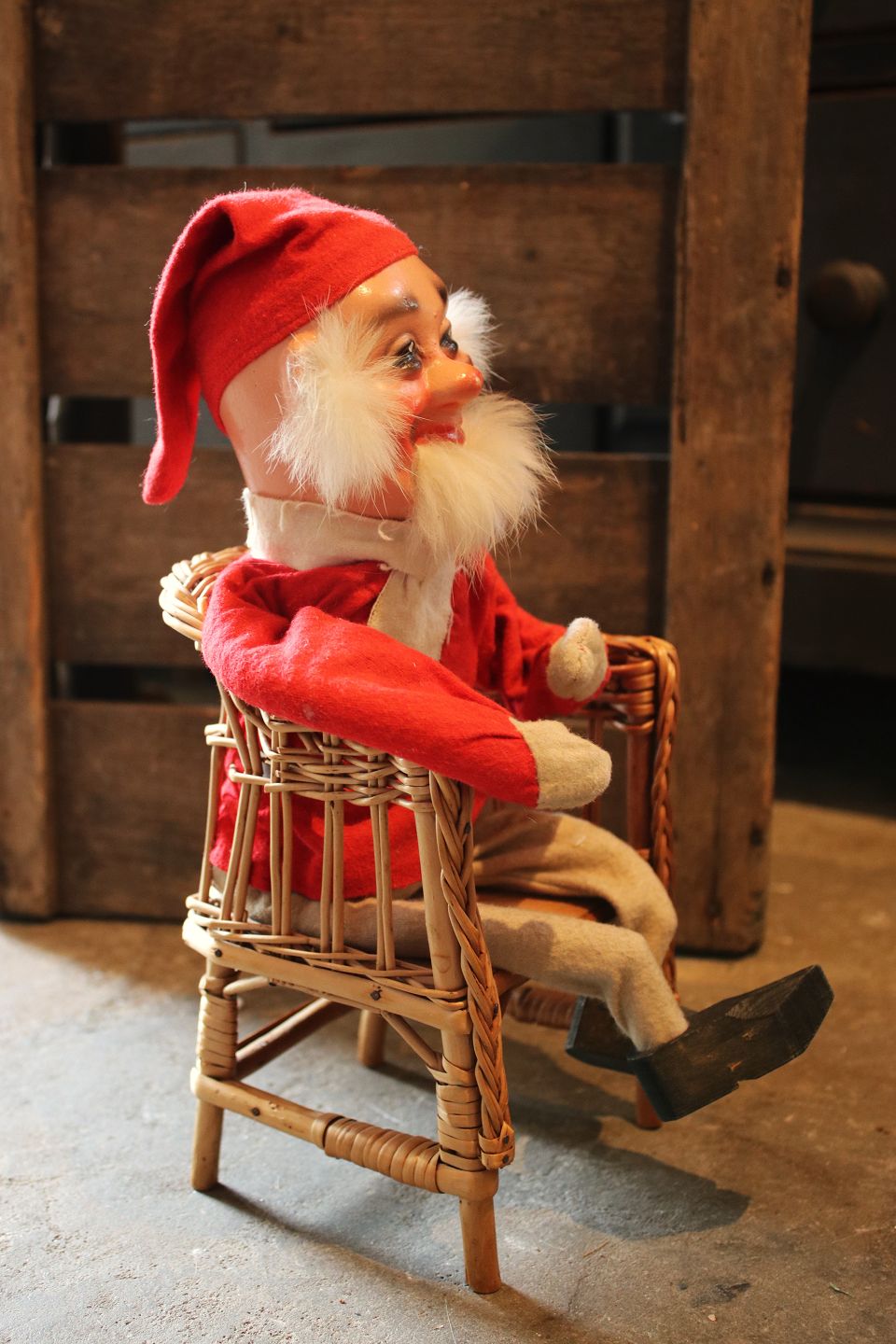 Old shop Santa in felt clothes and clogs sitting in an old wicker chair. Height: 30cm. Item number: Jul nr. 546
