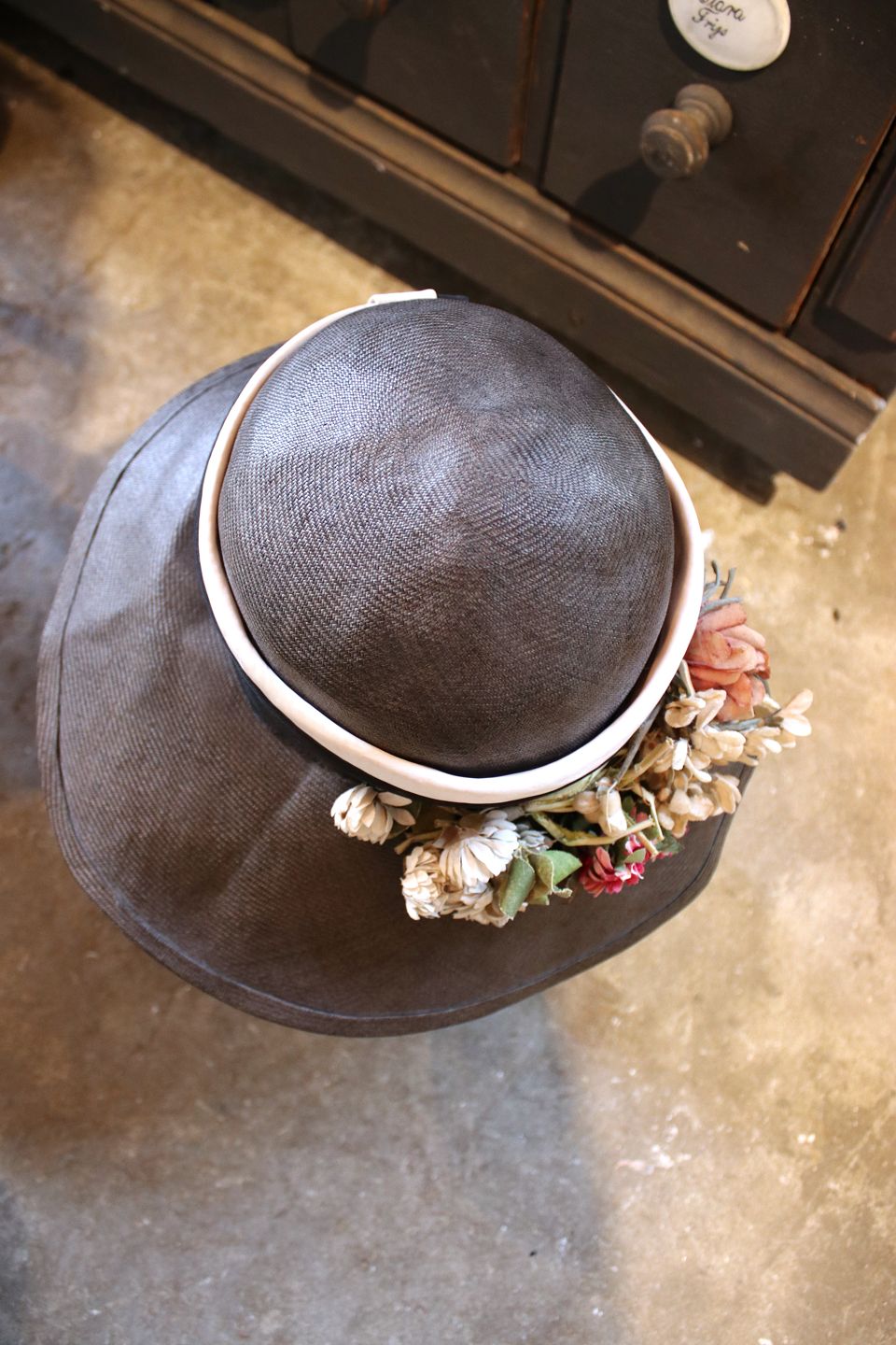 Old French vintage hat from the 40s with bouquet of fabric flowers.