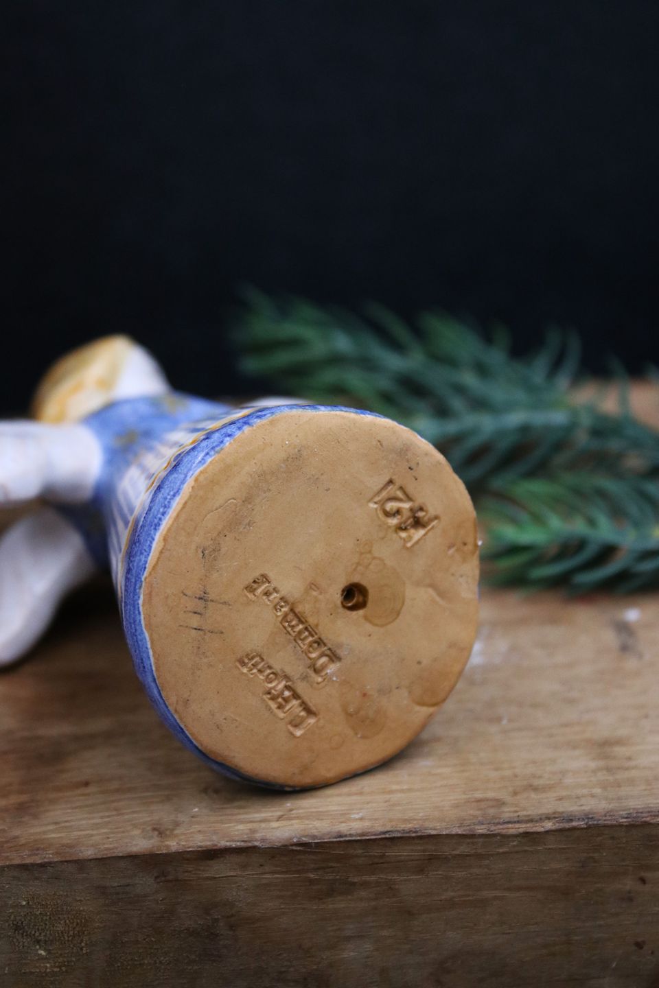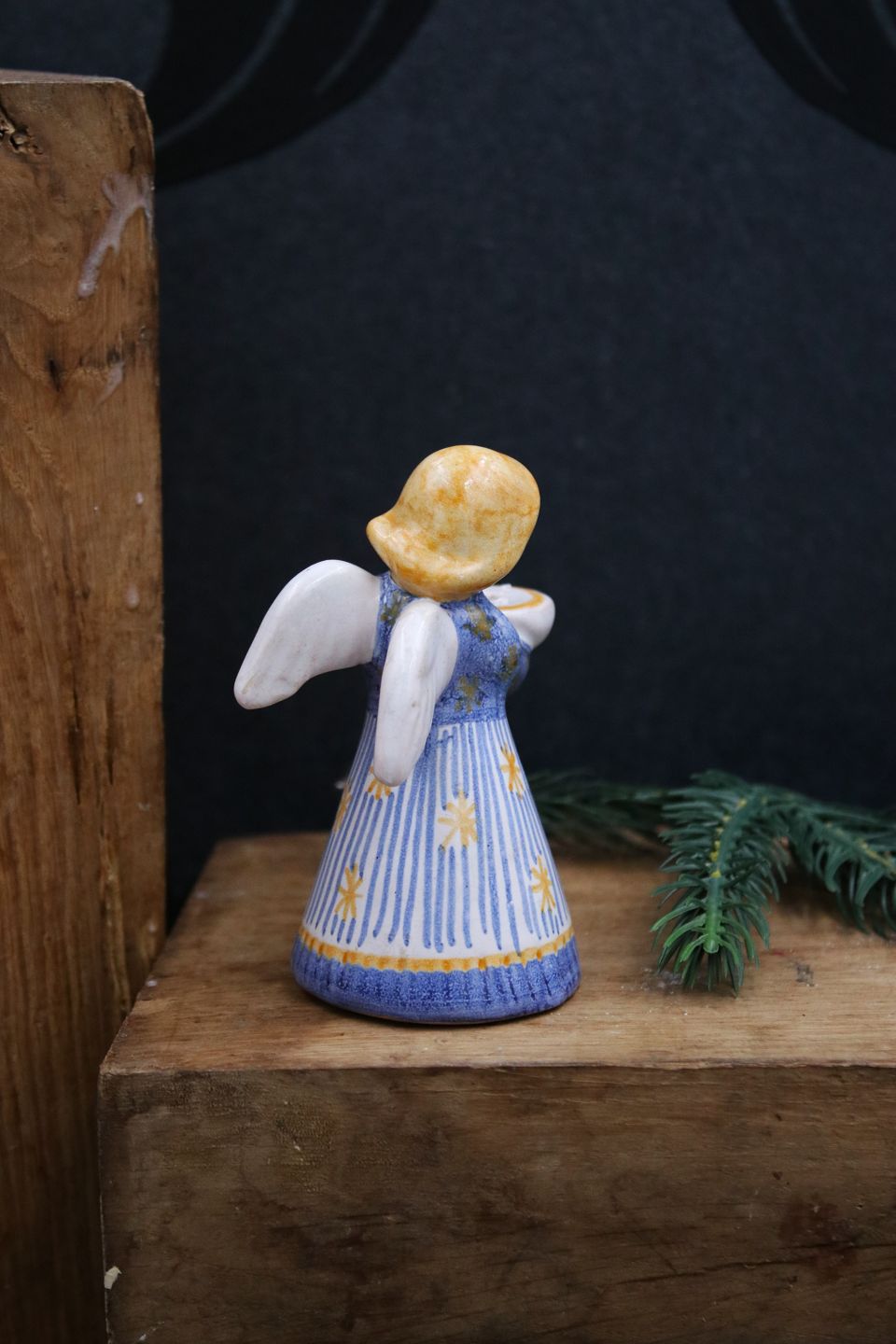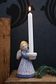 L. Hjorth glaseret keramik engel i blå og gul farve der holder et lille stearinlys. H: 9,5cm. Er i fin stand.