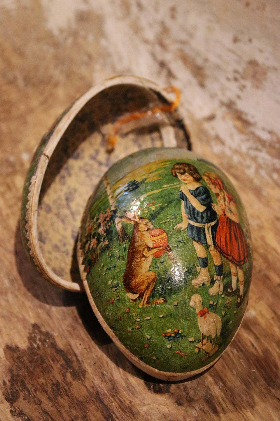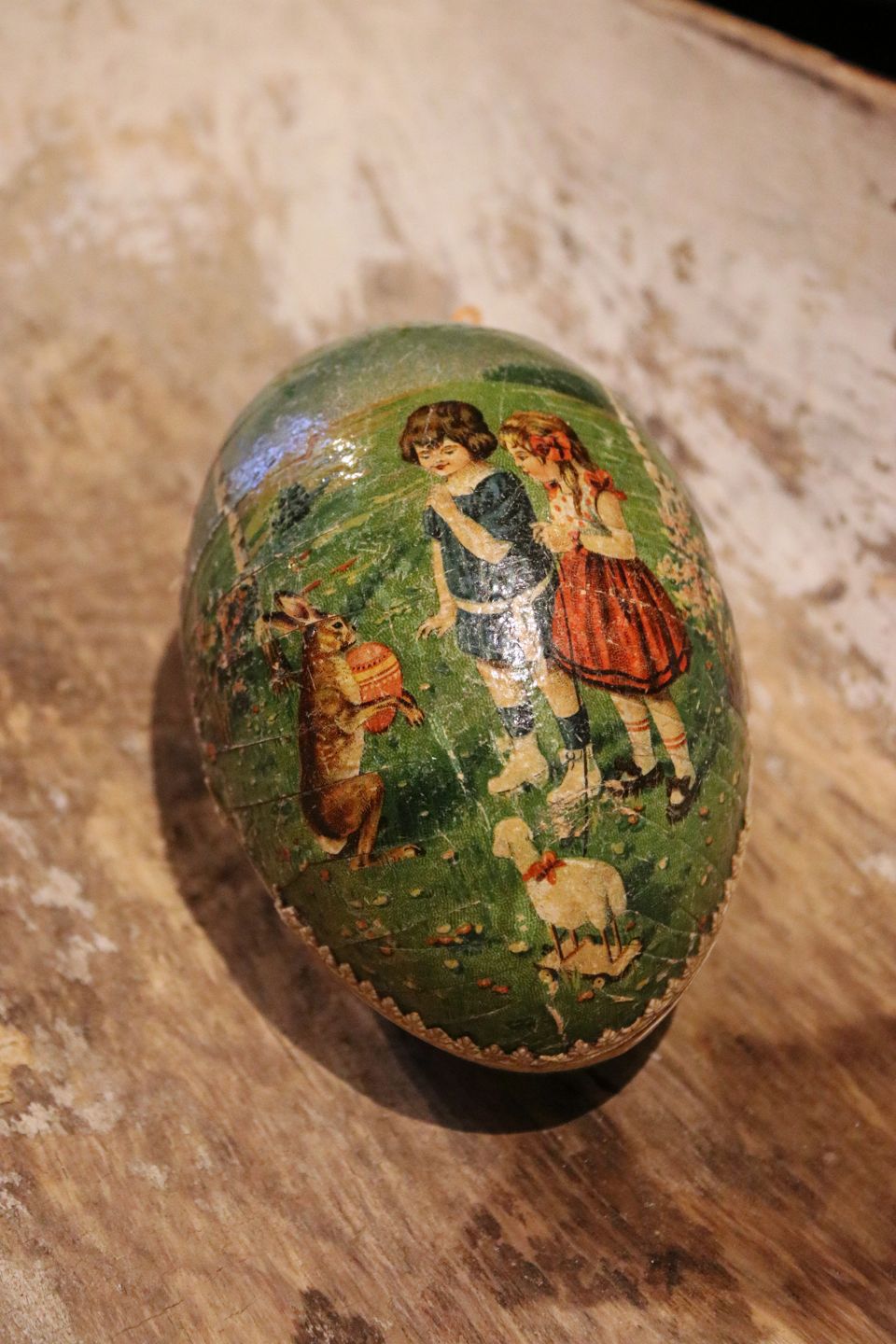 Old Easter egg in papier-mâché from the early 1900s with a motif of a little boy and girl with the Easter bunny. Height: 11.5cm.