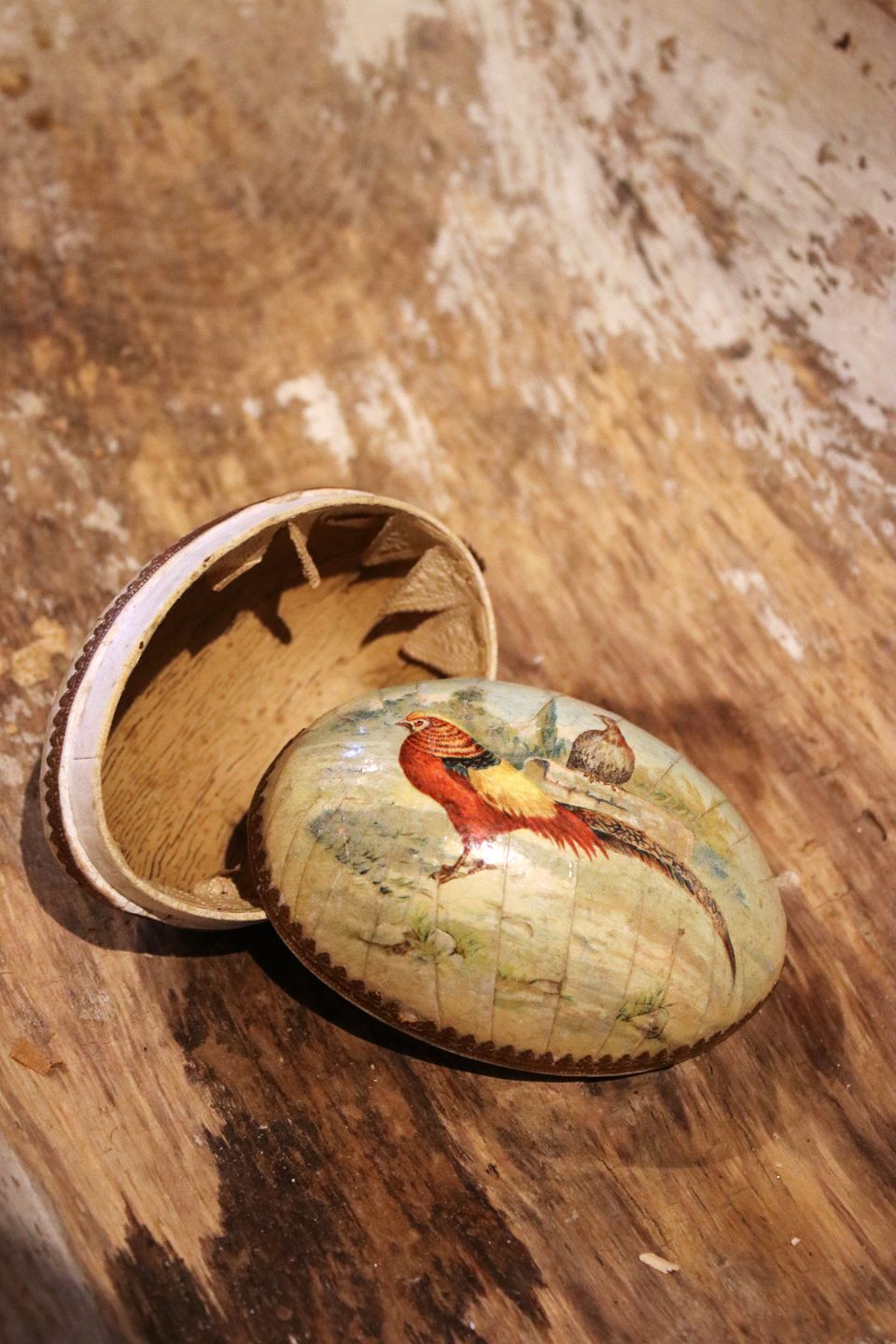 Old wooden Easter egg with painted peacocks from the early 1900s, dated inside 1904. Height: 10.5cm. Item number: Påskeæg nr.8
