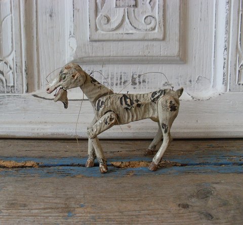 Stor træfigur i form af hest dekoreret i forskellige mørke farver fra 1920erne.