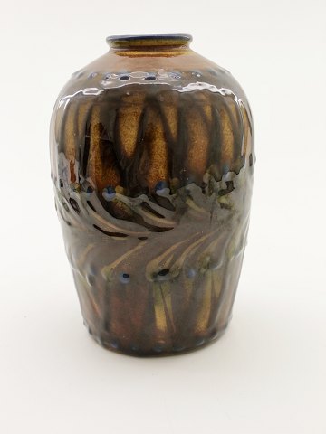 Dansk Stentøj B&G 1704 Vase med låg / Urne Brun glaseret med stiliserede bomster i relief 21 cm Cathinka Olsen Signeret CO