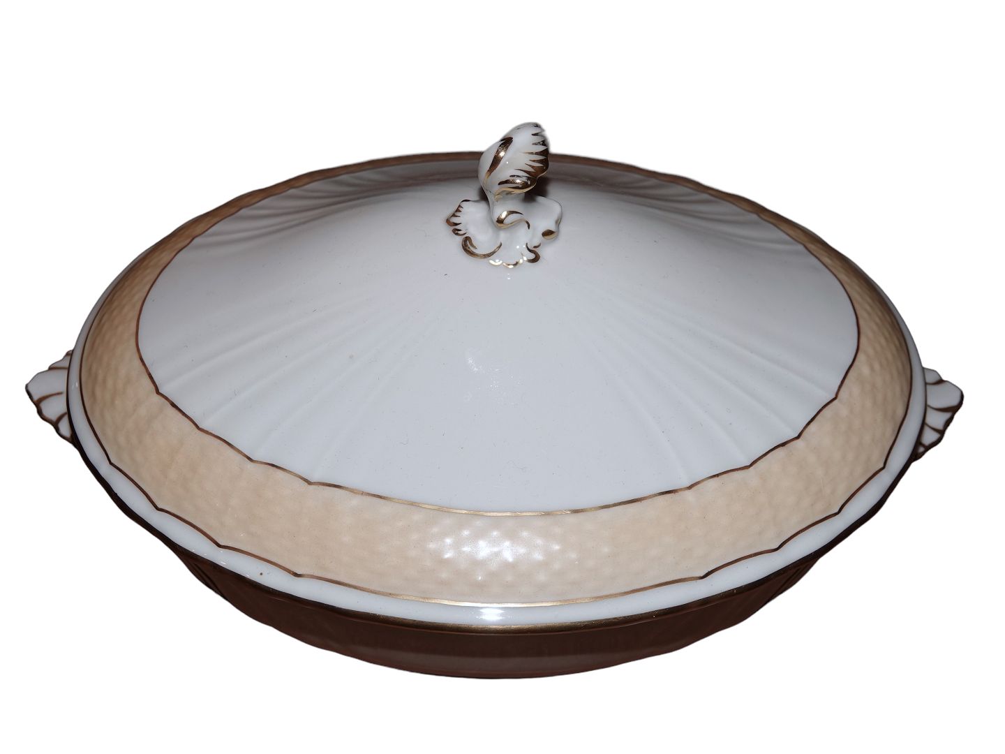 Description: Royal Copenhagen Chamois Fond, oblong lidded bowl.