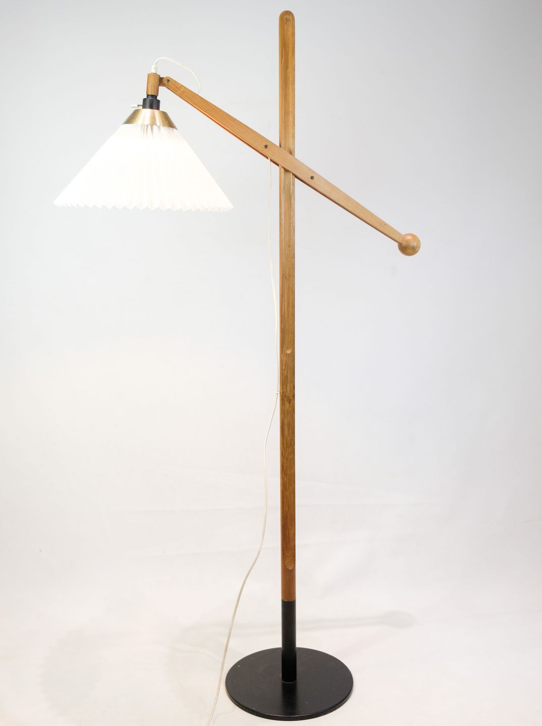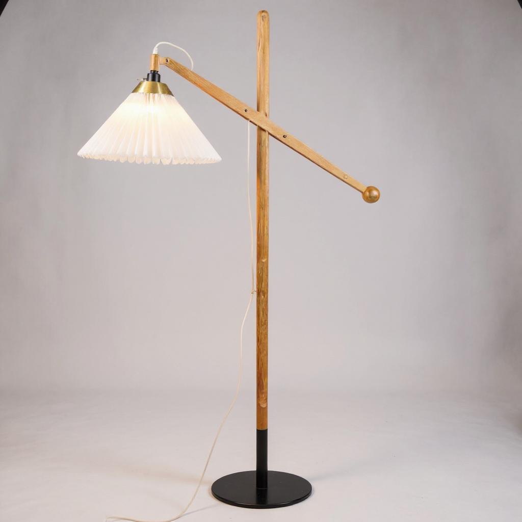 Description: Floor lamp, model 325 by Le Klint, designed by Vilhelm Wohlert in teak with original shade from around the 1950s, Denmark. It is a rather sought-after floor lamp, due to its age and good condition.