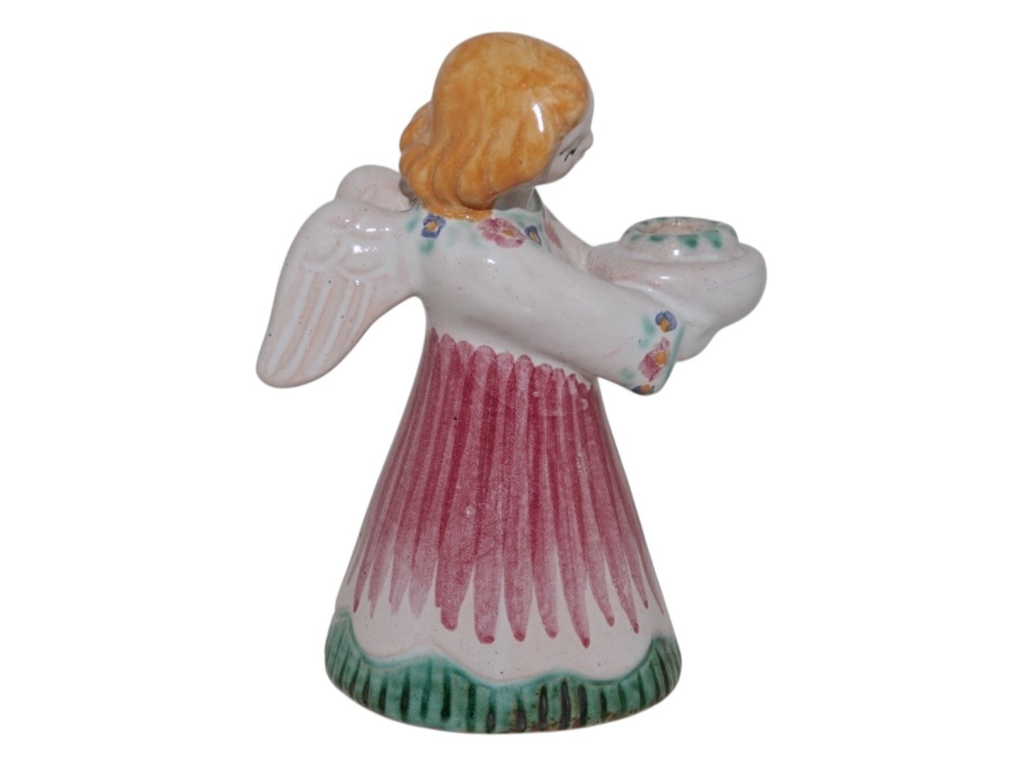 Description: Hjorth art pottery, angel figurine / candle light holder. Red, green and yellow color.