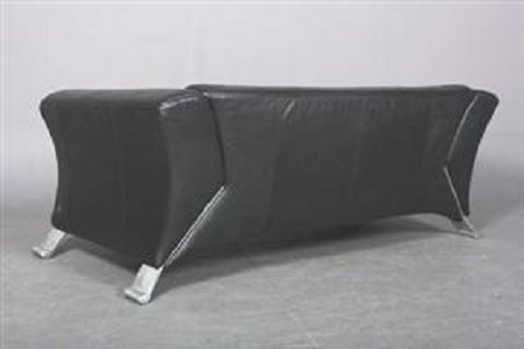 Beskrivelse: Rolf Benz. Tre-pers sofa betrukket med sort skind med 'Maori' mønster, ben af aluminium. Udført hos Benz Møbelproduktion model 322. L. 205 cm.