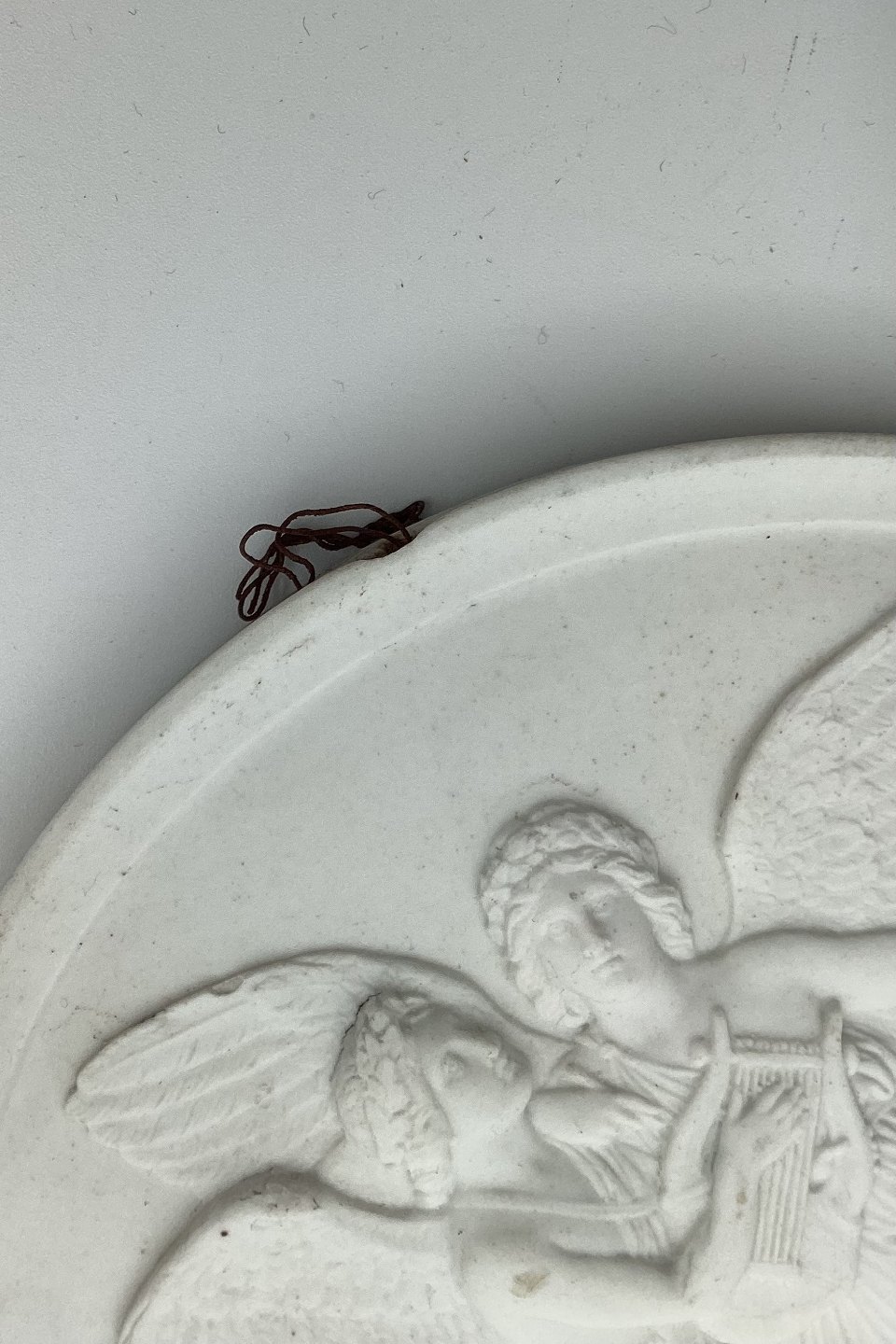 Beskrivelse: Bing & Grøndahl Biscuit Platte Poesiens og harmoniens Genier No 106. Kopi fra 1866 efter Thorvaldsens original fra Rom 1843. Har mindre skår på kanten, øverst midt på (se foto) Måler 14,5cm