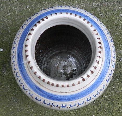 Beskrivelse: Stor krukke eller vase fra Leo Enna´s lervarer fabrik. Bemalet i blåt med blomster. I perfekt stand. Signeret på bunden af kunstneren med Leo Enna. 31 cm høj.