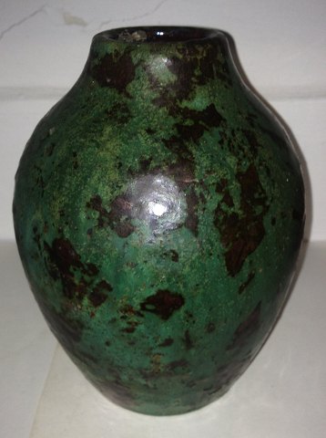 Description: Vase in ceramic by Jens Pedersen from the 1930s. Covered by a green and black speckled glaze. Is in good condition with no damage or repairs. Signed by the artist on the bottom with JP, nephew to the artist Soren Kongstrand. The vase is 15 cm high.