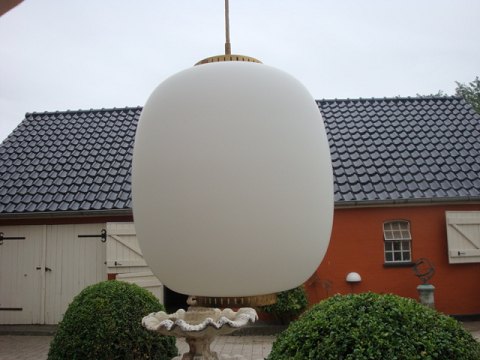 Beskrivelse: Kinapendel af Bent Karlby. Opalglas og med messing i bund & top. Måler 39 cm i højden og Ø98.5cm
