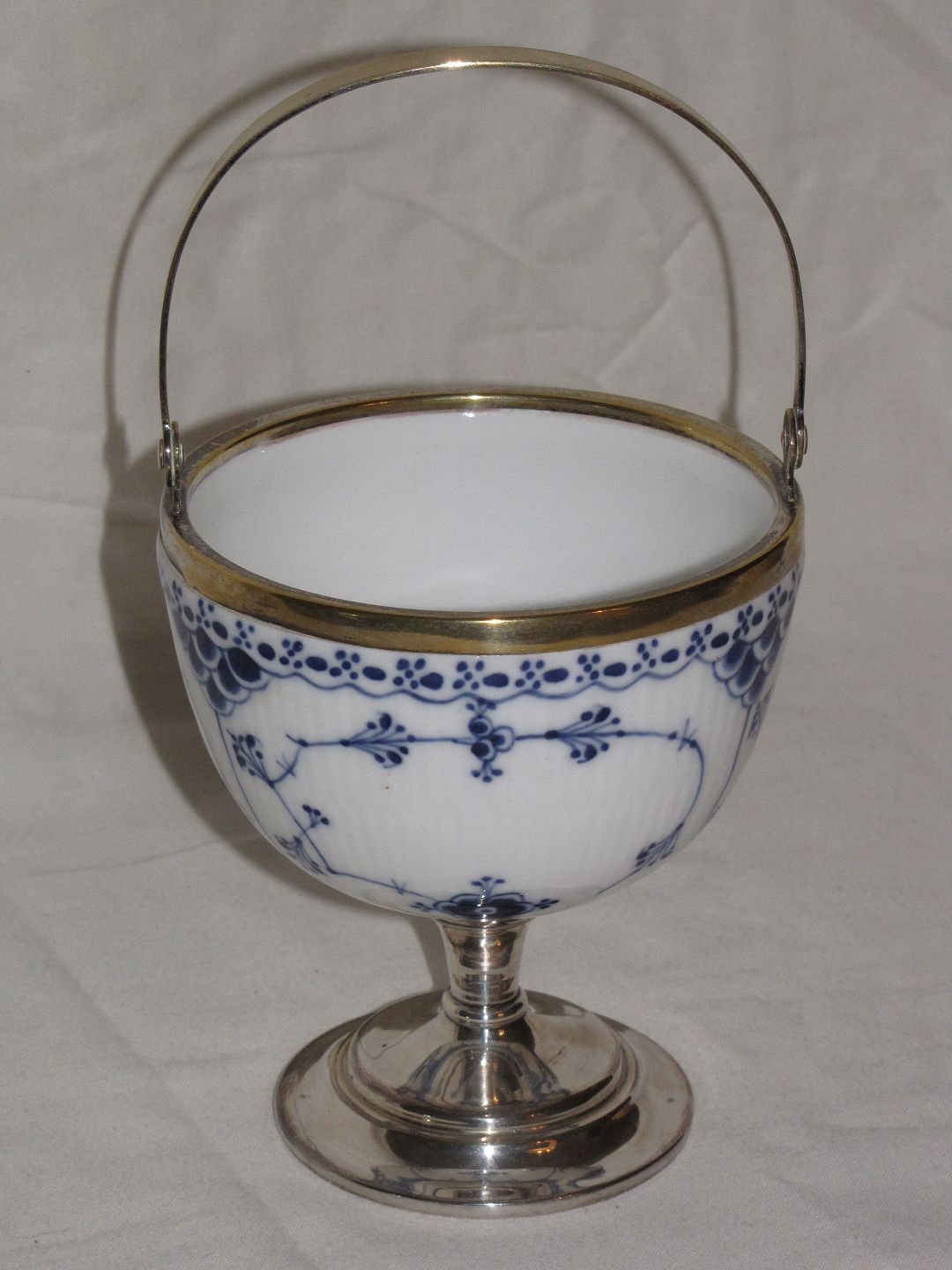 Beskrivelse: Musselmalet Riflet Sukkerskål på fod m. sølvplet fra Royal Copenhagen. 1. sortering