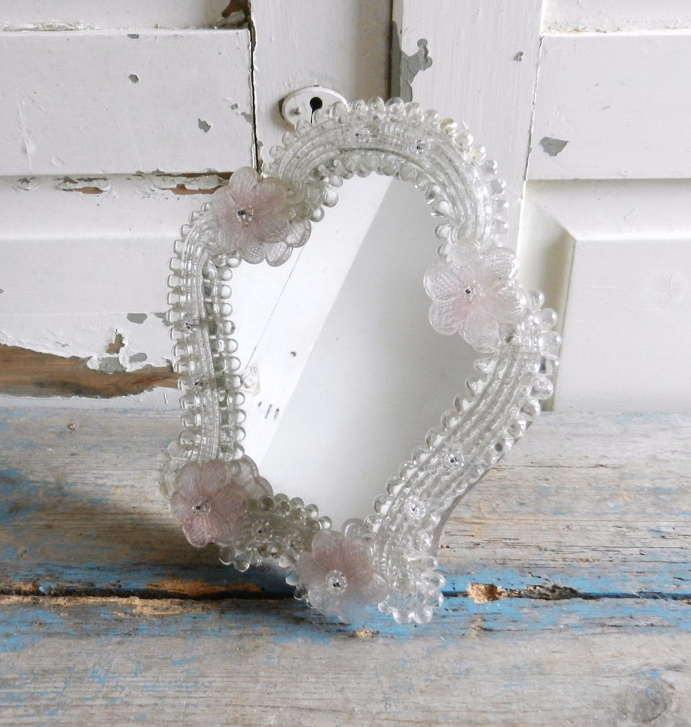 Beskrivelse: Smukt lille Venetiansk bord spejl, udsmukket med glas blomster i sart lyserød farve.