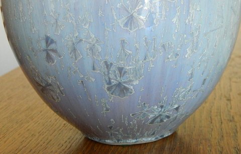 Beskrivelse: Lågkrukke eller urne af Aage Birch fra 1984. Glaseret i en fantastisk blå krystalglasur Fremstår i god stand . 19 cm høj og 14½ cm i diameter midt på krukken. Signeret af kunstneret med "Birch" samt produktionsåret "84"
