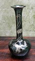 Beskrivelse: Art Nouveau perioden: Langhalset vase i keramik med floral dekoration af indlagte svungne blomster i sølv. Metalarbejde og vasen fremstår i god stand uden skader eller reparationer. Der ses dog et par ridser på vasen hvilket fremgår af foto. På bunden modelnummer. Formoder den er fremstillet omkring 1900 i mellem-Europa - muligvis Frankrig eller Belgien ! Vasen er 20 cm høj.