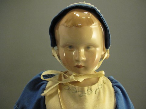 Beskrivelse: Else porcelæns dukke fra Bing og Grøndahl. perfekt stand! står fast på et stativ på en træ fod. mærket i nakken. bing og grøndahl, eles, doll of the year, 1984. ca 33 cm høj.