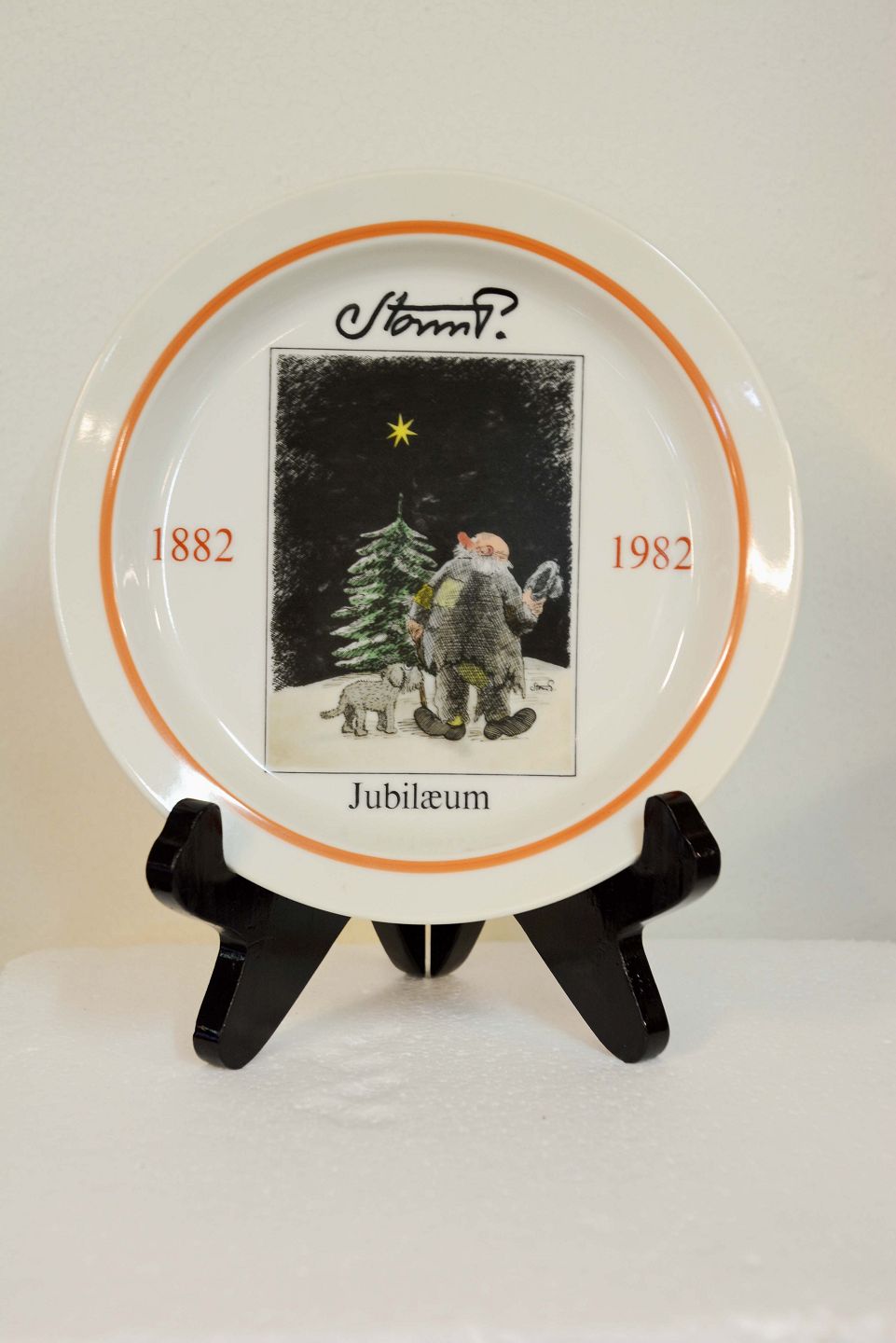 Beskrivelse: En kongelig Storm P. jubilæumsplatte fra Royal Copenhagen. 100 års jubilæum år 1882-1982.