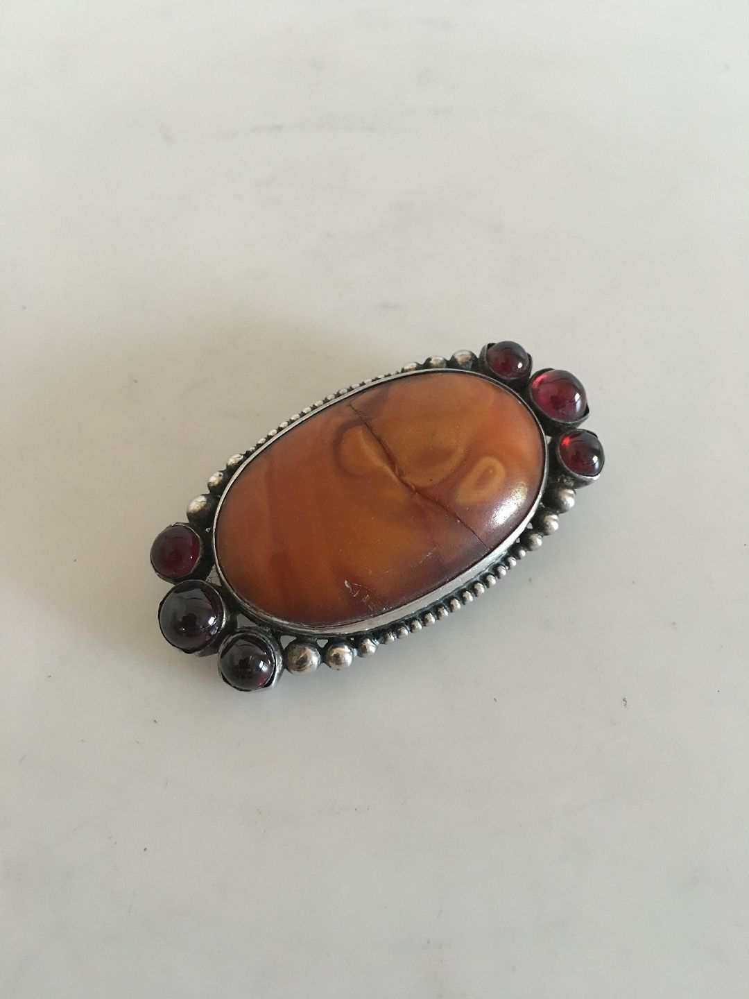 Description: Mogens Ballin Silver Brooch with Amber and Red Stones. In good condition, but the large amberstone has a crack down the middle. Measures 5.5 x 3 cm / 2 11/64" x 1 3/16". Weighs 21.6 g / 0.76 oz.