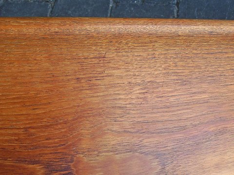 Beskrivelse: Langt serveringsbræt i teak på stel i sortlakeret metal. Fremstår med brugsspor på brættet.