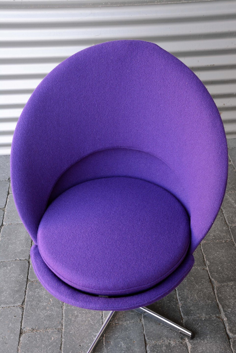 Beskrivelse: Mørklilla Cone chair designet af Verner Panton. Stolen her er den helt gamle model, med fjedre i pude. Fint stofbetræk og minimale brugsspor på stolens fod.