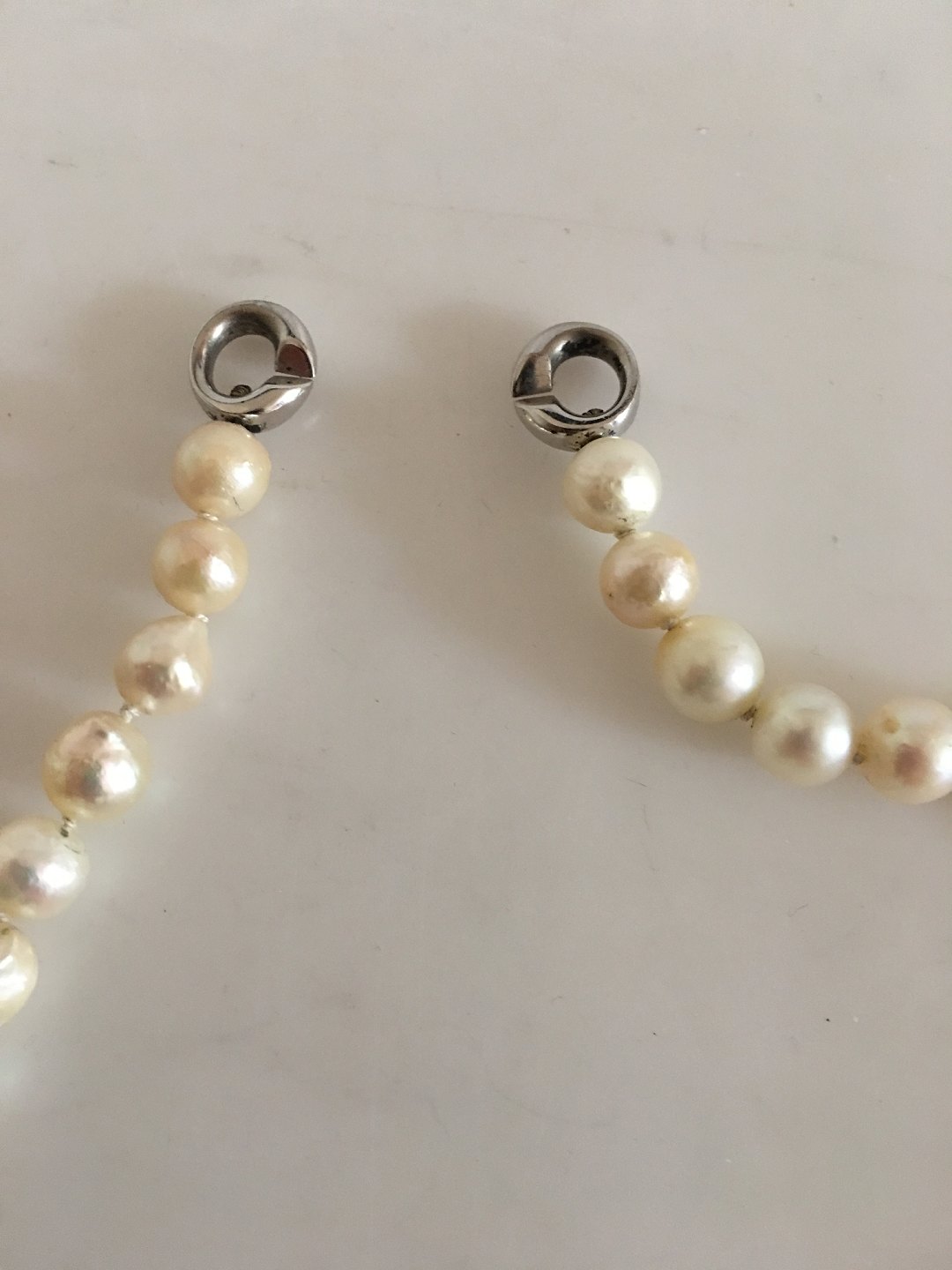 Beskrivelse: Georg Jensen Perlehalskæde med Lås af Hvidguld. Kæden er 63 cm L. Perlerne måler 0.6 mm. Vejer 49 gram. I god stand.