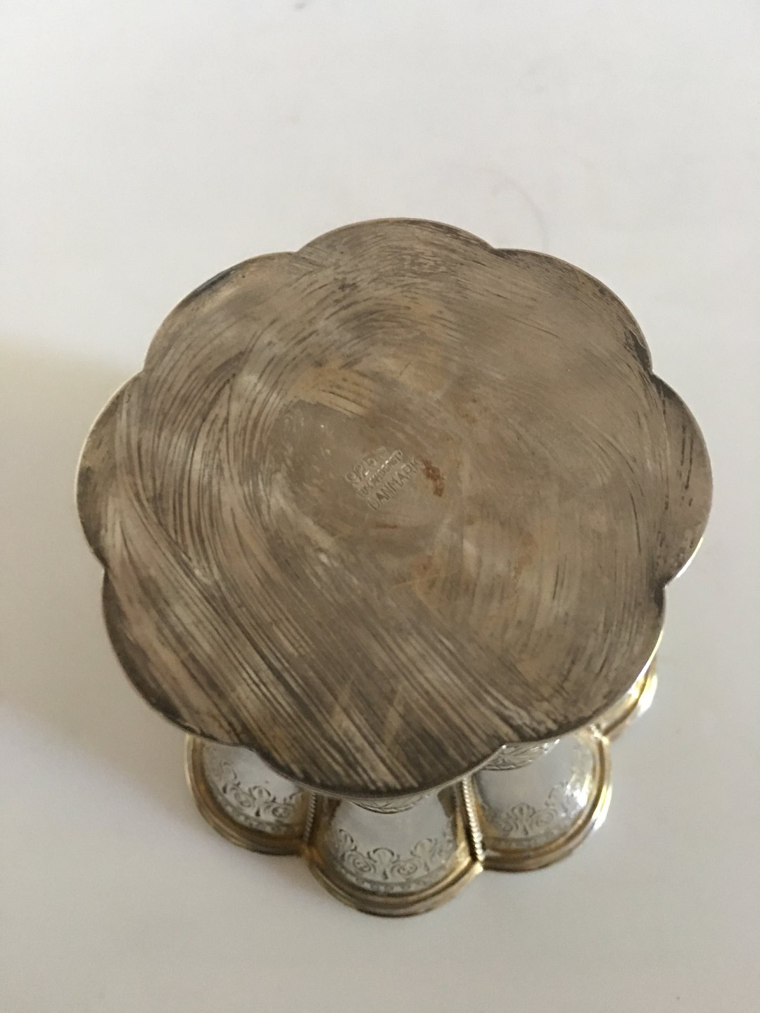 Beskrivelse: Anton Michelsen Margrethe Bæger med indvendig sterling sølv forgyldning. Måler 8.3 cm Høj. 9.2 cm diameter. Vejer 142 gram. Bægeret ser ud til at have været helt forgyldt hvor den udvendige forgyldning er blevet poleret af. Desuden fejlslåen polering underneden.