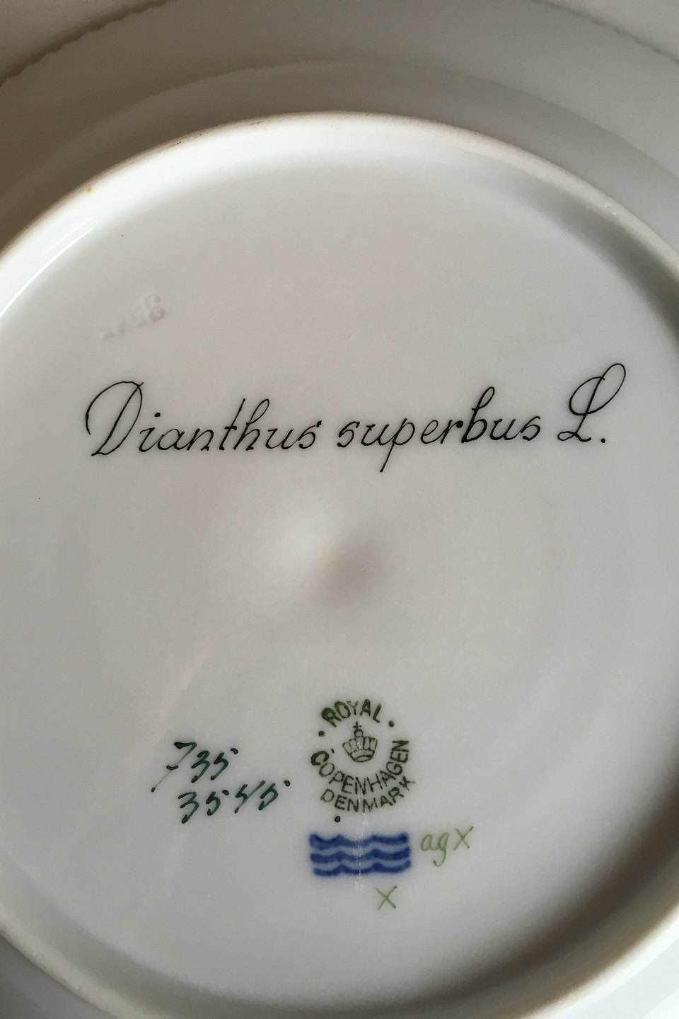 Beskrivelse: Royal Copenhagen Flora Danica Dyb tallerken No 735/3545.