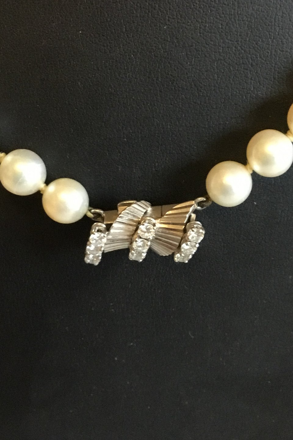 Description: Pearl necklace of round white saltwater pearls with 18ct lock of white gold with nine brilliant-cut diamonds totaling approx. 0.45 ct. Color Top Wesselton (F-G), Clarity: VS. Measures 49 cm / 19 19/64 in. Weighs 40 g / 1.41 oz.