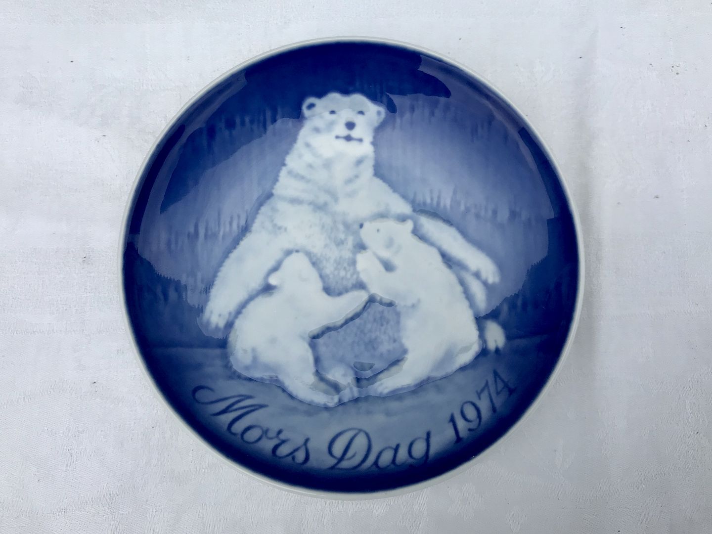 Beskrivelse: Bing & Grøndahl, Mors dag platte, 1974, Isbjørn med unger, 18cm i diameter, Design Henry Thelander *Pæn stand*